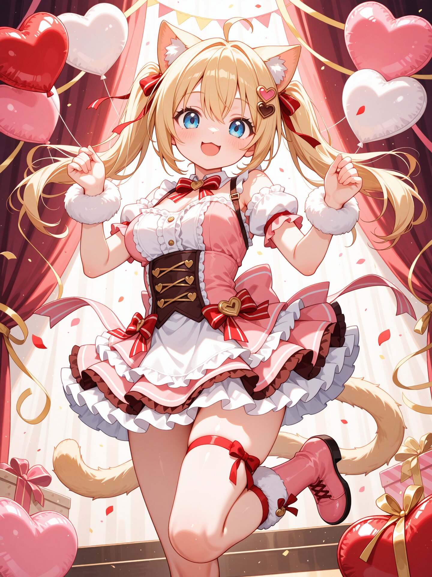 1girl, solo, blue eyes, blonde hair, braid, hair between eyes, natural cat ears, natural cat tail, :3, a cute Valentine-themed outfit, heart-themed frilled dress with ribbon decorations, lace trim, soft layered skirt, delicate chocolate-colored accents, small heart accessories, ribbon choker, elegant gloves, soft gentle smile, slightly tilting head, holding a beautifully wrapped chocolate box toward the viewer, one leg slightly raised in a playful pose, warm and affectionate expression, directly looking at viewer, romantic Valentine indoor setting, decorated with heart garlands, floating heart ornaments, and ribbon decorations, soft glowing fairy lights, chocolate gift boxes and flower petals placed around, warm pink and red ambient lighting, sparkling heart-shaped light particles, high detail, masterpiece, high quality illustration