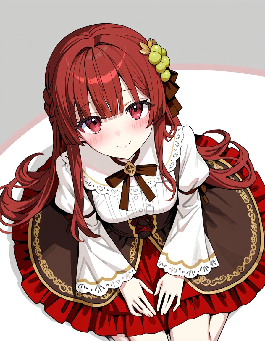 A cute young girl wearing a gothic-lolita and girly fashion outfit inspired by rum raisin chocolate candy. She wears a deep wine-red A-line lolita jumper skirt with a chocolate-brown bodice panel and chocolate-brown layered hem frills decorated with elegant gold embroidery. The dress features delicate white lace, wine-red and chocolate-brown ribbons with antique gold centers, antique gold fittings, and subtle raisin-inspired motifs.a sheepish smile, She wears an pastel red blouse with puff sleeves. Her hair is styled in a neat half-up low roll hairstyle with straight bangs, colored dark chocolate brown with a matte, light-absorbing texture. Her eyes are deep burgundy red with low saturation and subtle highlights, not competing with green accents. Her hair is adorned with a muscat grape hair ornament made of translucent (light green grapes:1.3), catching subtle prismatic light reflections only on the accessory. The background has a soft Valentine’s theme with a pastel pink romantic atmosphere, gentle warm light leak effects appearing only in the background, creating a dreamy and sweet mood. Soft cinematic lighting, anime-style illustration, clean background, highly detailed. Light is used as an accent, not overpowering. the girl is sitting on the ground, looking up at the viewer, high-angle view, top-down perspective, slightly tilted camera, soft foreshortening, gentle eye contact