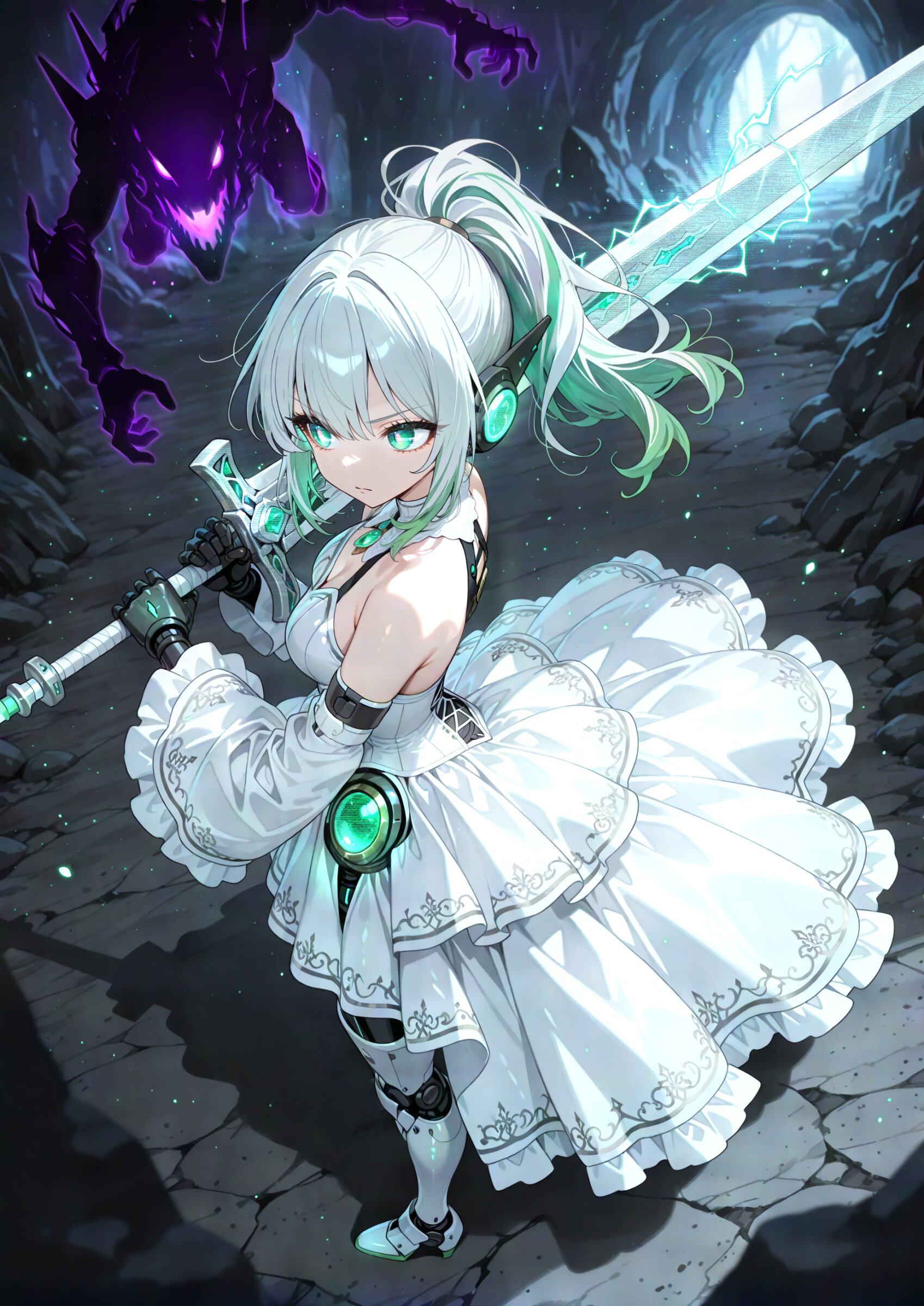 1girl, huge cool greatsword, (weapon focus:1.1) in hands, holding huge cool weapon mechanism, machine, (from above:1.2), (upper body:1.2), (blurry foreground:1.0) looking to the side, (25 years old:1.0), (medium breasts:1.2), (two-tone hair, grey and ever green hair, shoulder length hair, high side ponytail medium bangs:1.0), (beautiful face:1.1), (clear white small eyes:1.0), green pupils , fighting stance, weapon over shoulder, (mechanical black hands:1.0), black robot ears, , (mechanical white legs:1.1), white mechanical thighs, neon trim, medieval times fantasy world, (cybernetic gynoid:1.0), (mech suit:1.0), (white gothic cuirass:1.0), (robot joints:1.0), (white gorgeous modest wizard's dress skirt:1.1), , glossy silver body with metallic luster cyborg, bare shoulders, (Decorative embroidery:1.0), (white gorgeous dress:1.1), (overskirt:1.0), (white sleeve:1.2), electrokinesis, (battle:1.2), duel , (looking away:1.0), from side, (huge aquamarine silhouette of human,serious monster silhouette:1.2), , colorful gem, crystal, cave, rock, stone, nature, dirt, blurry background, dynamic action super fine concept art, hard surface, 8K, masterpiece, best quality, amazing quality, very aesthetic, absurdres, professional art lots of details, , overexposure, shiny-glistening, (watercolor style:0.0), (pastel color style:1.0) 4ur4_illu,shiny, glowing, glowing particles, glowing light particles, light particles, <lora:noline (1):1.0> <lora:sdxl2-flat2-512b:0.2> <lora:facelightup_xl_v10:0.5> <lora:V2_yakumo_alchemy:0.5> <lora:Aura_illu:0.1>