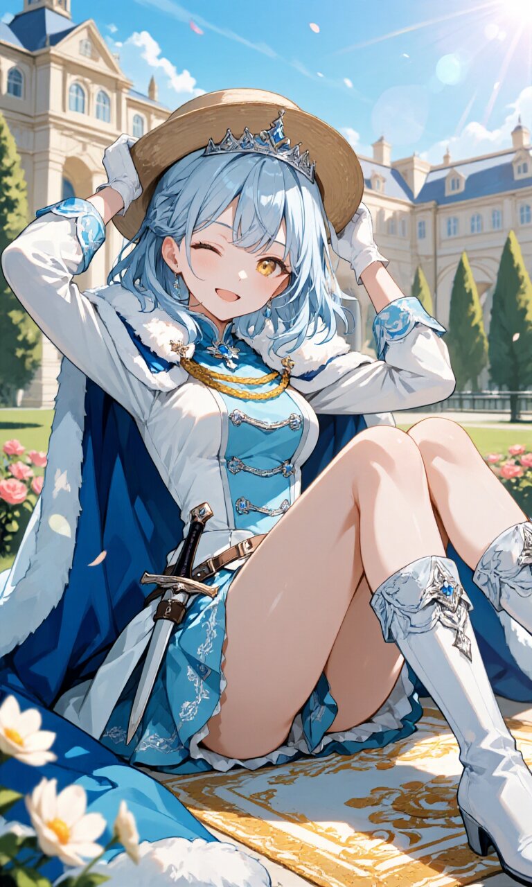 1girl, a beautiful 15-year-old girl with light blue medium-length hair and striking yellow eyes gazes directly at the viewer with a cheerful smile, playfully closing one eye. She wears an extravagant (luxurious White Prince costume:1.6) with intricate embroidery, long flowing sleeves, and a (Skyblue luxurious Cape:1.3) that billows elegantly behind her. Her outfit includes a (Blue luxurious mini skirt:1.4), (White luxurious boots:1.3), and (White luxurious gloves:1.2), exuding a princely charm. A (dagger on waist:1.3) adds a touch of adventure, while a (luxurious crown on head:1.3) and a straw hat with a delicate ribbon complete her regal yet whimsical look. She sits gracefully on a luxurious square carpet in a (flower garden:1.5) outside a grand palace with art nouveau architecture, her knees drawn up slightly. The afternoon sun casts warm (sunbeam) and soft (lens flare) across the scene, enhancing the romantic academia and classic academia atmosphere. The blue sky and calm, light ambiance create a dreamy, storybook-like setting. Every detail—her delicate facial features, flawless skin, flowing hair, and ornate clothing—is rendered in insanely detailed, masterpiece quality.