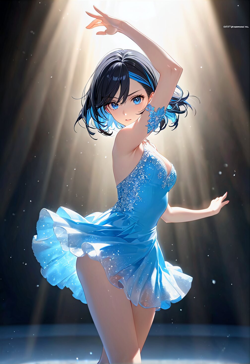 ((ultra high resolution,extremely detailed CG,official art,dynamic shadow,dynamic lighting,perfect anatomy,)) ((very short hair,detaioled light blue colored inner black hair,super detailed streaked hair,detailed light blue eyes,)) 1woman,solo,((stylish pose,action,)) figure skate,dress,