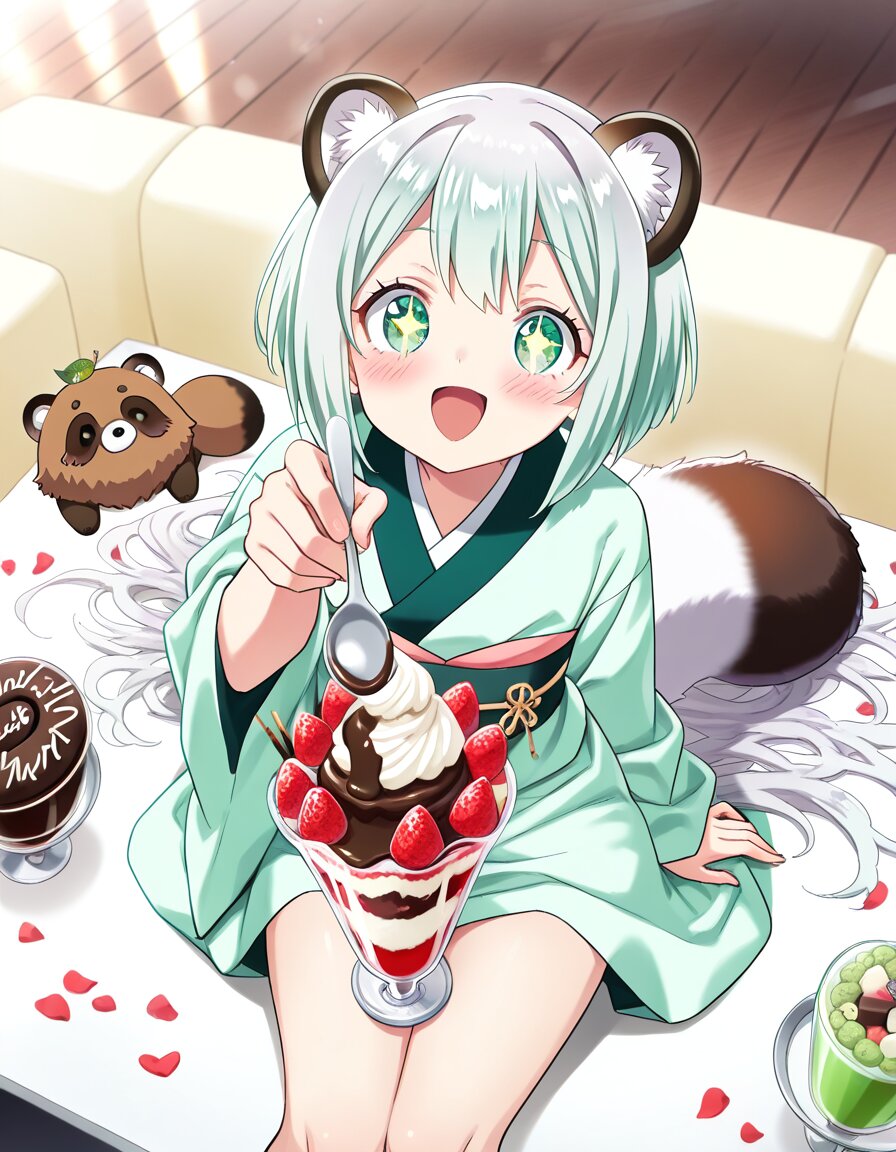 1girl, solo, flat chest, (light red short bob hair:1.4), (fluffy tanuki ears:1.35), (large fluffy tanuki tail spreading naturally behind:1.35), cute tanuki girl, wearing (modern style mint green pastel kimono:1.3), subtle asanoha geometric hemp leaf patterns all over kimono, (deep navy obi with thin silver line:1.25), simple obi knot, sitting relaxed on plush sofa, (three-quarter view from above:1.3), (slightly angled overhead:1.25), looking up at viewer, (knees together:1.2), (legs closed:1.15), (closed legs sitting pose:1.2), eating (enormous gigantic chocolate parfait:1.45) on table in front, (towering tall parfait overflowing massively:1.4) chocolate layers whipped cream thick drizzle brownie chunks strawberries chocolate pocky wafers sprinkles, very happy eating face, (wide sparkling eyes:1.35), subtle blushing cheeks, light flush on face, gentle blush, open mouth bliss tongue slightly out, holding large spoon reaching down, foreground table: (tabletop crowded with many various colorful parfaits:1.45), (lots of assorted parfaits spread out on table:1.4), tall glasses lined up chocolate strawberry matcha fruit berry kiwi mango rainbow layers whipped cream fresh fruits toppings nuts chocolate curls sprinkles heart shaped decorations pink ribbons, abundant sweet dessert variety covering the table, background: Valentine's Day themed cafe interior, pink red heart garlands floating hearts rose petals scattered chocolate motifs string lights cozy romantic atmosphere, warm soft lighting soft bokeh pastel mint chocolate pink scheme, detailed food rich textures, anime style, masterpiece, best quality, ultra detailed, cute, kawaii
