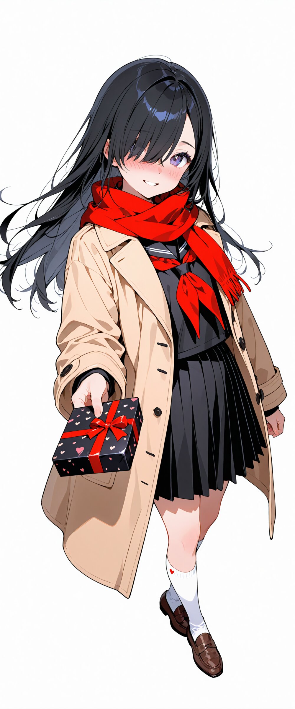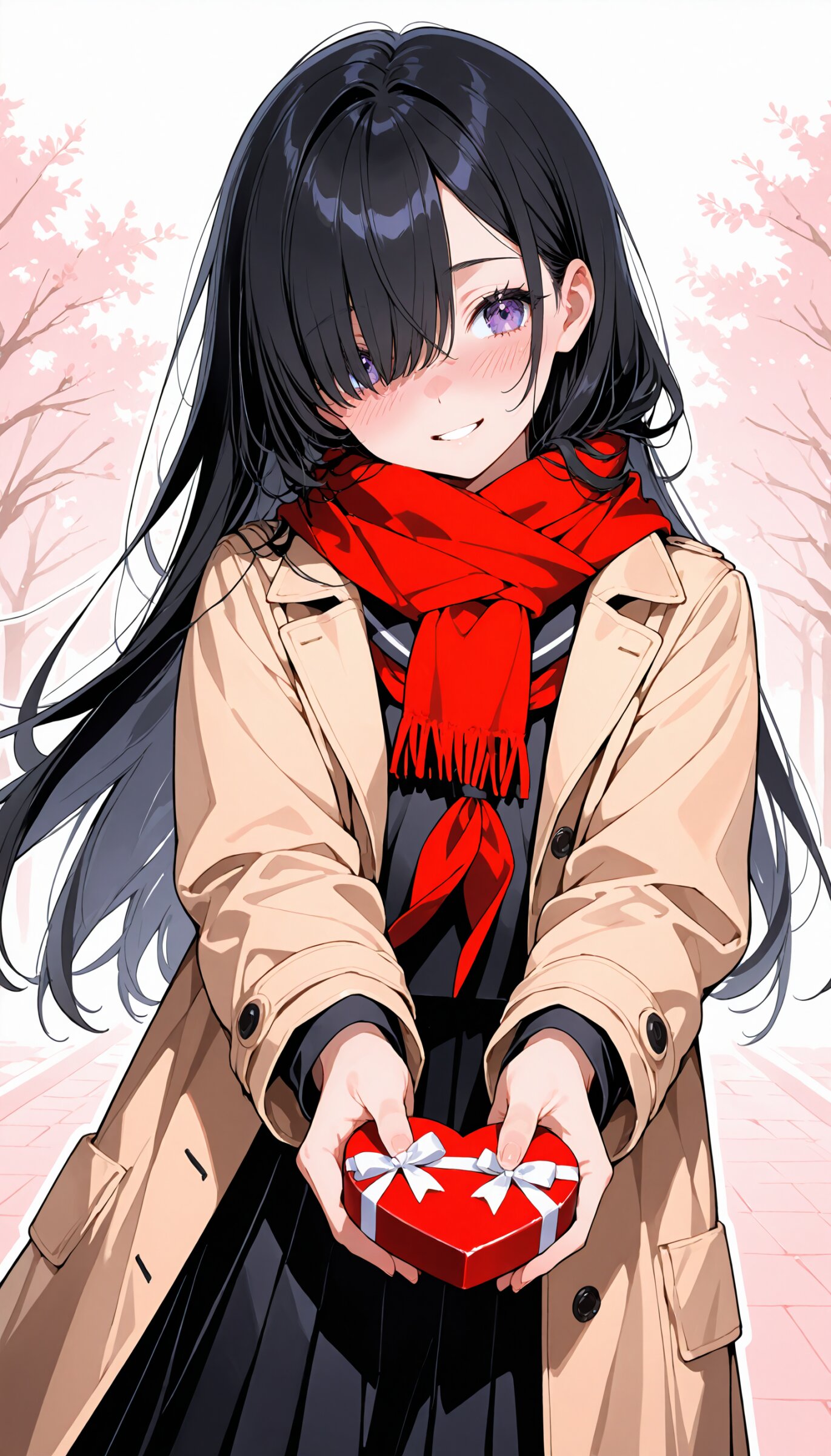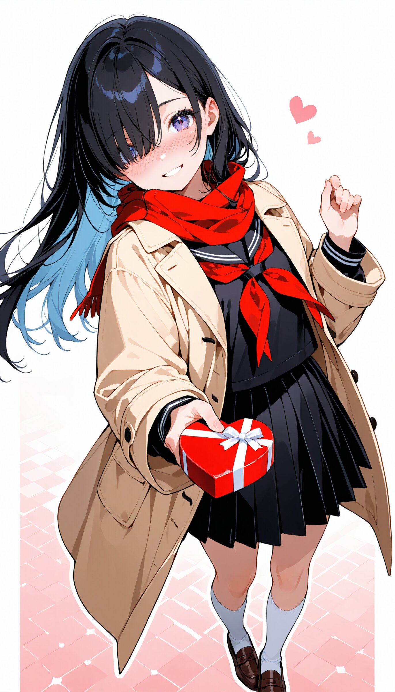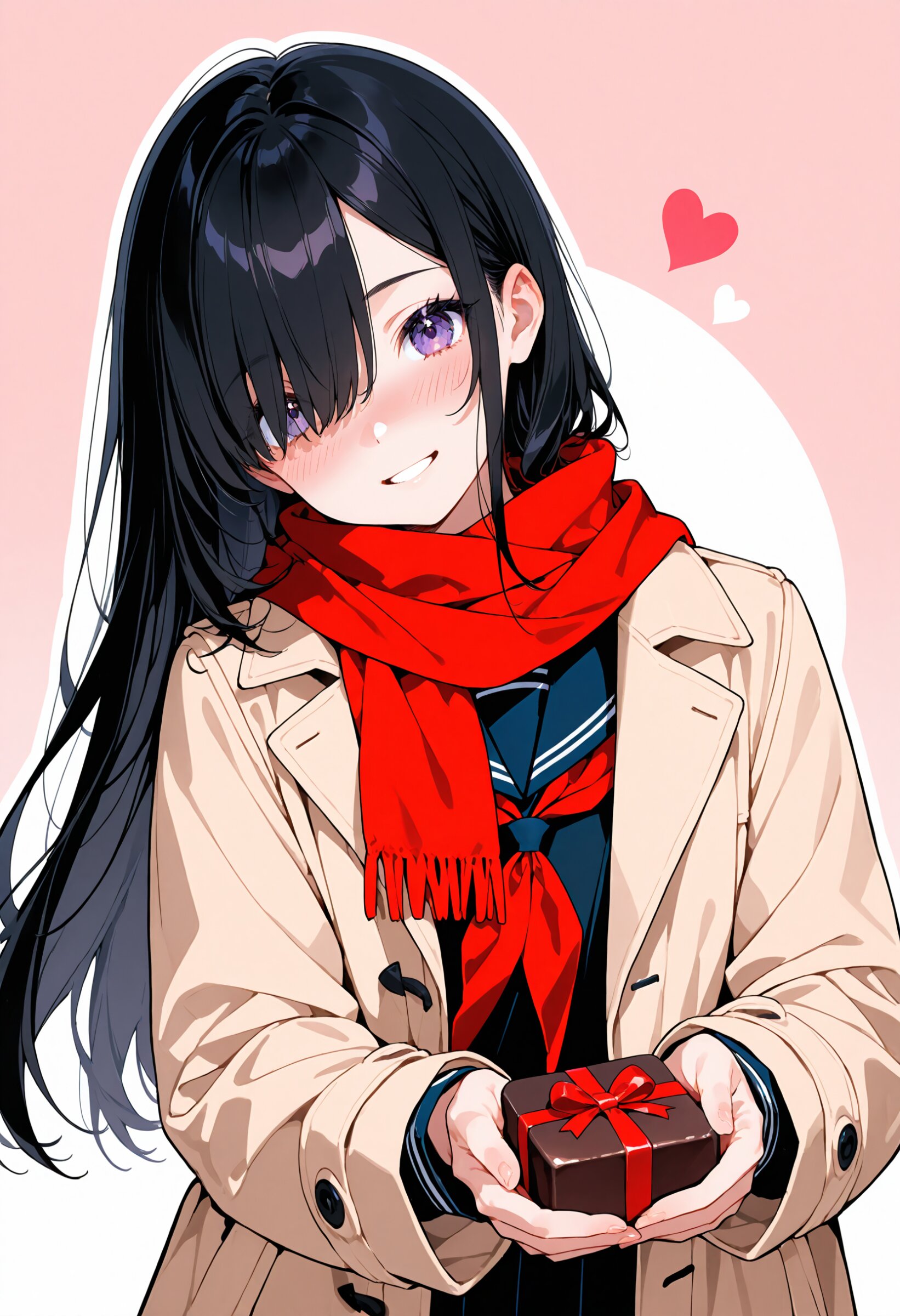 (rating: sensitive:1.2), score_9, score_8_up, score_7_up, score_6_up, source_anime, (delicate illustration), (watercolor style illustration, flat colors), (perspective, super dynamic angle from front, looking away), diagonal view. 1girl, black long hair, hair over eye, one eye covered bangs, straight hair, nose blush, head tilt, (black seifuku, sailor uniform, long red scarf, (beige duffle coat), present a wrapped small chocolate gift ((towards)) with one hand), (Valentine's fashion illustration, sweety, ultra-intricate detailed), flat design, white outline, patterned fabric, beautiful composition, in the style of cute anime girl. BREAK insanely beautiful and detailed clothes, intricately hair, beautiful small face, long eyelashes, double eyelids, parted lips, smile, (kawaii, cute), flat chest, slender, {exquisitely delicate skin}, perfect anatomy, beautiful hand, perfect fingers, dynamic angle, dynamic pose, BREAK (DOF), sharp focus on the girl, emphasizing depth, BREAK perfect AI rendering, three-quarter view. BREAK (masterpiece, aesthetic quality, 8K, ultra-detailed), (whimsical color palette, bold colors, flat colors), perfect design, amazing quality, high quality, absurdres, highres, natural lighting,