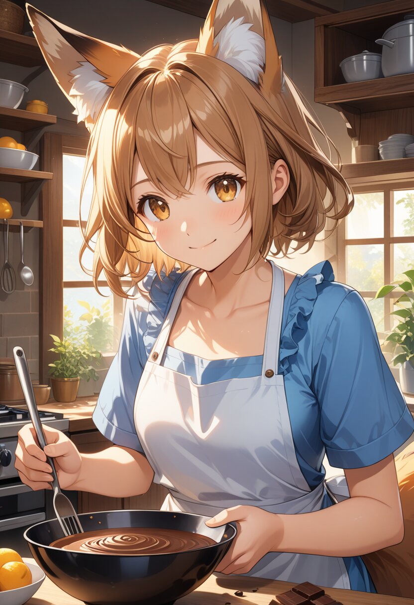 (high resolusion,illustration,ultra detailed 8k art,extremely detailed CG,official art,clothes reflecting light,detailed shiny skin,detailed background:1.3), ((highly detailed beautiful face and eyes),anime_style, fox_ears, girl, light_brown_hair, double_eyelids, long_eyelashes, fluffy_tail, apron, kitchen, mixing_bowl, making_chocolate, warm_lighting, expressive_eyes, delicate_features, cozy_atmosphere, gentle_smile