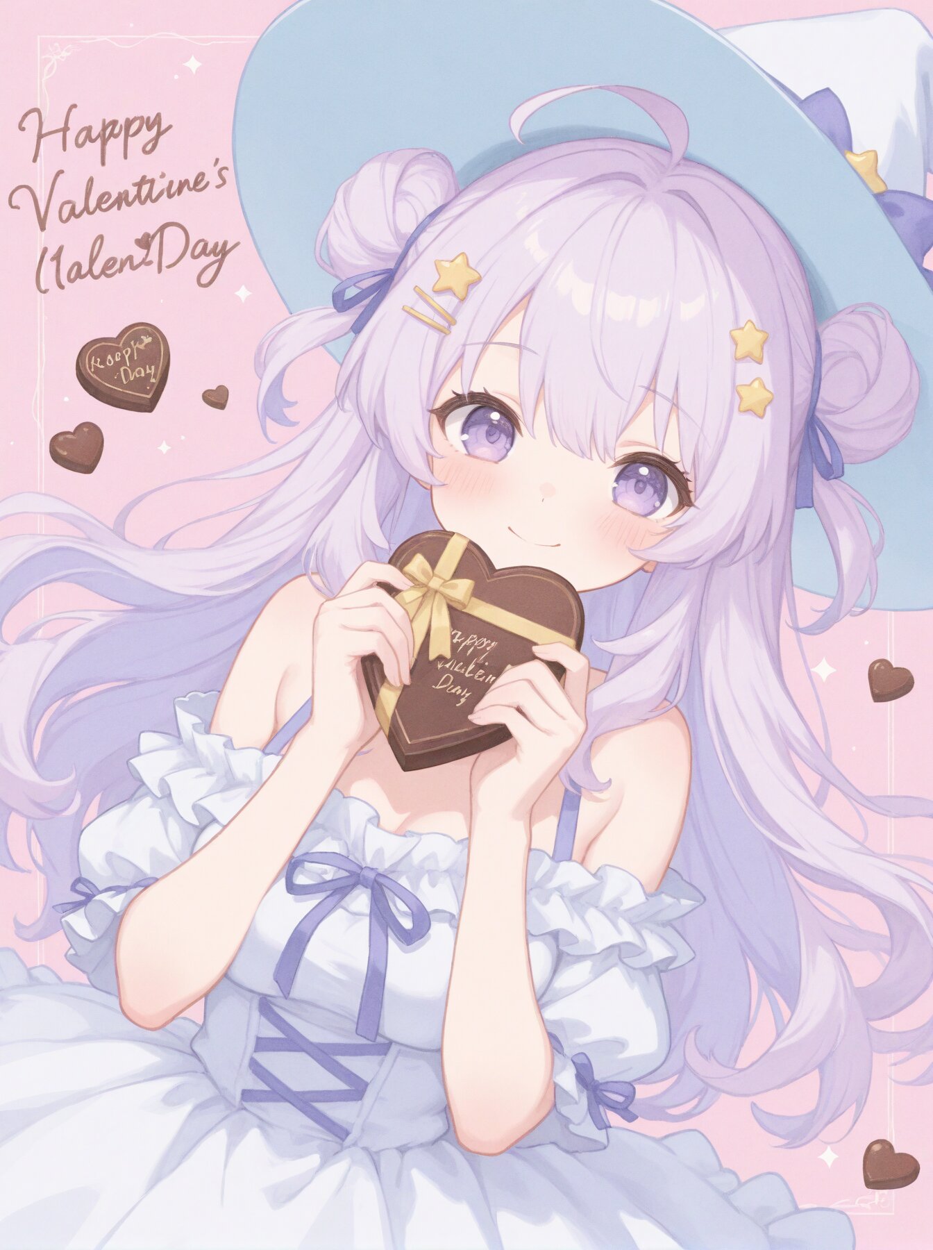 1girl, solo, cute anime style, light purple hair, long hair, double buns, star hair ornament, purple eyes, smile, blush, looking at viewer, witch hat with big blue ribbon, white frilled dress, off-shoulder, holding heart-shaped chocolate box, "Happy Valentine" text on box, pink background, floating hearts, magical atmosphere, pastel colors, masterpiece, best quality, highly detailed, masterpiece、best quality、amazing quality, solo, kawaii, cute, dynamic pose, dynamic angle, looking at viewer, Pastel color palette, (Upper body: 0.9), soft cute girl with soft lavender hair and light blue inner highlights, long hair with two side buns and loose curls, one stray hair, large, bright purple eyes, a gentle smile, a faint glow, anime-style with emphasized contours, flat pastel-toned shading.single ahoge, medium breasts,star-shaped hairpin,, (soft pastel color palette:1.5), (pale colors:1.3), watercolor texture, matte finish, subtle shading, minimal contrast,