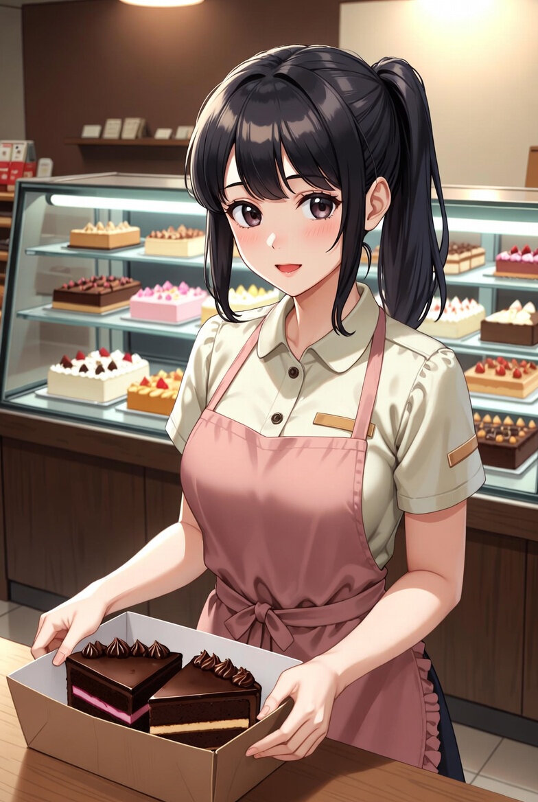 日本人女性18歳のイラスト。ケーキショップの制服の上にかわいいエプロンを着けていて、持ち帰り用の箱に、カットされたチョコレートケーキを2切れ入れるところ。ガラス製のショーケースの中にはたくさんのケーキが陳列されている。