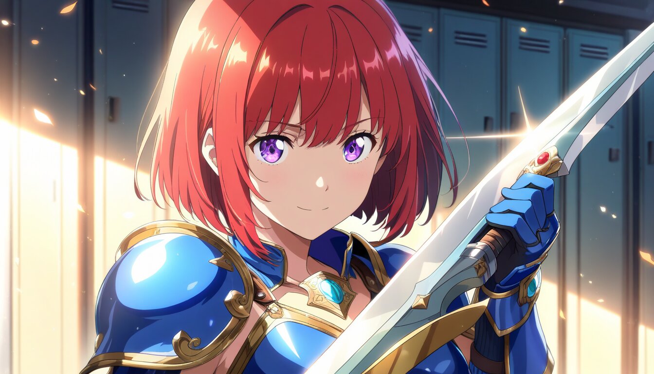 ((masterpiece)), ((best quality)), (ultra-detailed), anime style, Locker Room, a cute girl, 1girl, solo, (((armor))),blue bikini armor ,((warrior)), beautiful red hair, beautiful purple eyes, ((beautiful eyes)), short hair, bob cut, Holding a weapon in hand, gripping Sword,little smile