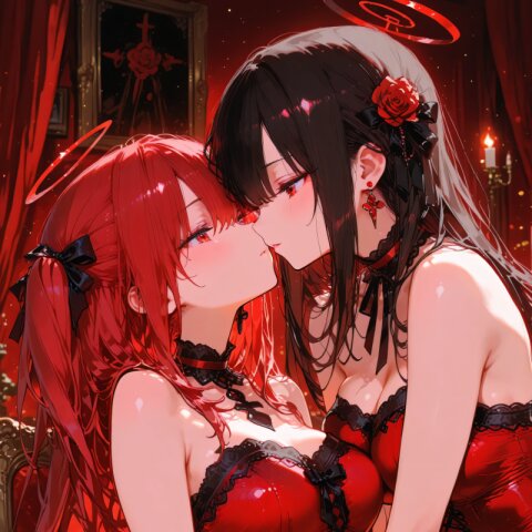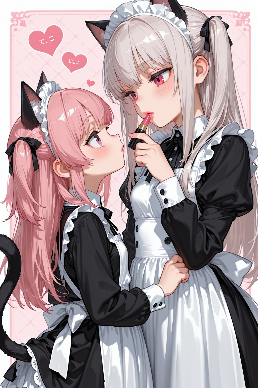 2 girls, holding lipstick, applying lipstick to each other, (1 cute girl: 1.3), (12yo), (child), kawaii, platinum hair, long hair, red eyes, (French maid), (black cat ears), (black cat tail),1 girl, (8 years old), child, cute, kawaii, (blush), young girl, (medium pink hair), dark pink eyes, (two side up), short stature, kindergarten clothes (light blue), small breasts, BREAK, happy mood, beautiful friendship