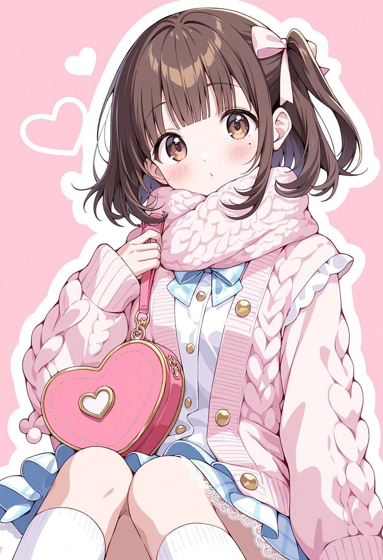 fluffy pastel pink cable-knit cardigan with large buttons, thick soft pink muffler scarf wrapped around the neck, layered lace frill mini skirt in white and light pink, over-the-knee socks with lace tops and ribbon bows, small pink heart-shaped shoulder bag with gold chain strap