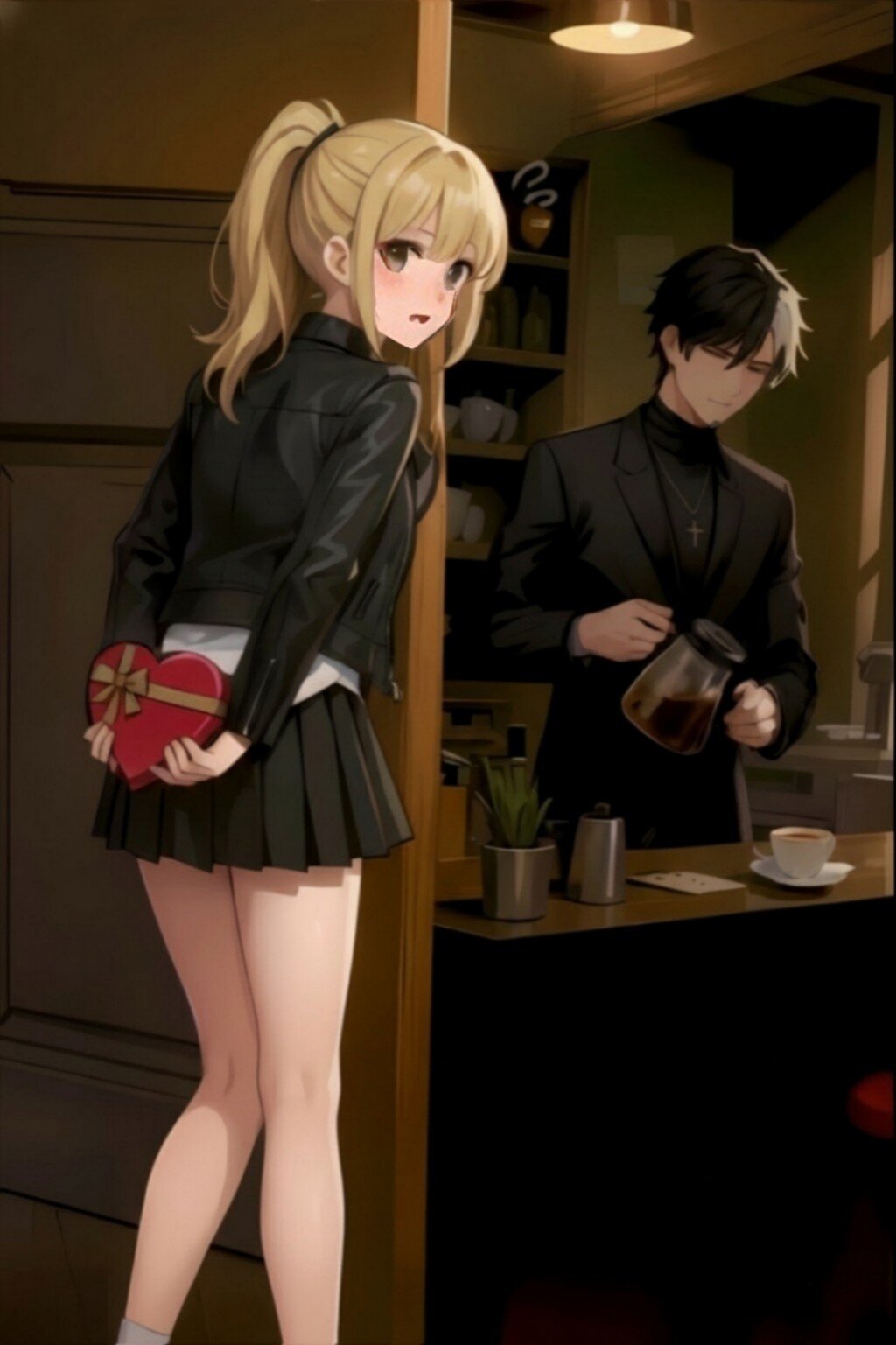 anime style, a young woman with long blonde hair tied in a high ponytail, wearing a black hoodie and a black pleated skirt, black sneakers with white socks. She is holding a red heart-shaped gift box behind her back, looking shyly towards a man. The man is a handsome bartender with short black and white hair, wearing a black suit with a cross necklace. He is pouring coffee from a glass pot into a cup on a wooden counter. There are coffee-making tools, cups, and a small potted plant on the counter. In the background, there is a bookshelf filled with books and a window with natural light. The setting is a cozy coffee shop. Soft lighting, warm atmosphere, slight blur in