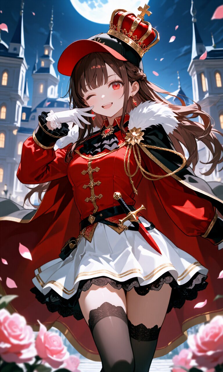 A 15-year-old girl with long, flowing brown hair and striking red eyes wears a red baseball cap tilted playfully to one side. Her delicate face features a cheerful smile, with one eye closed in a cute, mischievous expression. She strikes a hip-hop-inspired pose, radiating youthful energy. Her outfit is a (Red luxurious Prince costume:1.6) with long sleeves, a black jabot, and a (luxurious Black Cape with gold trim:1.3) flowing dramatically behind her. The ensemble includes a (luxurious White mini skirt with black lace trim:1.4), (luxurious Black thighhighs:1.3), and (luxurious White lace Gloves:1.3). A (dagger on waist:1.3) adds a hint of danger, while a (luxurious crown on head:1.4) crowns her with regal elegance. The scene is set outside a grand Palace with deconstructivist architecture, blending romantic and classic academia aesthetics. The night sky is illuminated by soft moonlight, casting a dreamy glow over blooming flowers. The atmosphere is magical, with petals drifting gently in the air. The image is photorealistic with insanely detailed textures—every strand of hair, fold of fabric, and glint of jewelry is rendered in 16k clarity, creating a masterpiece of beauty and artistry.