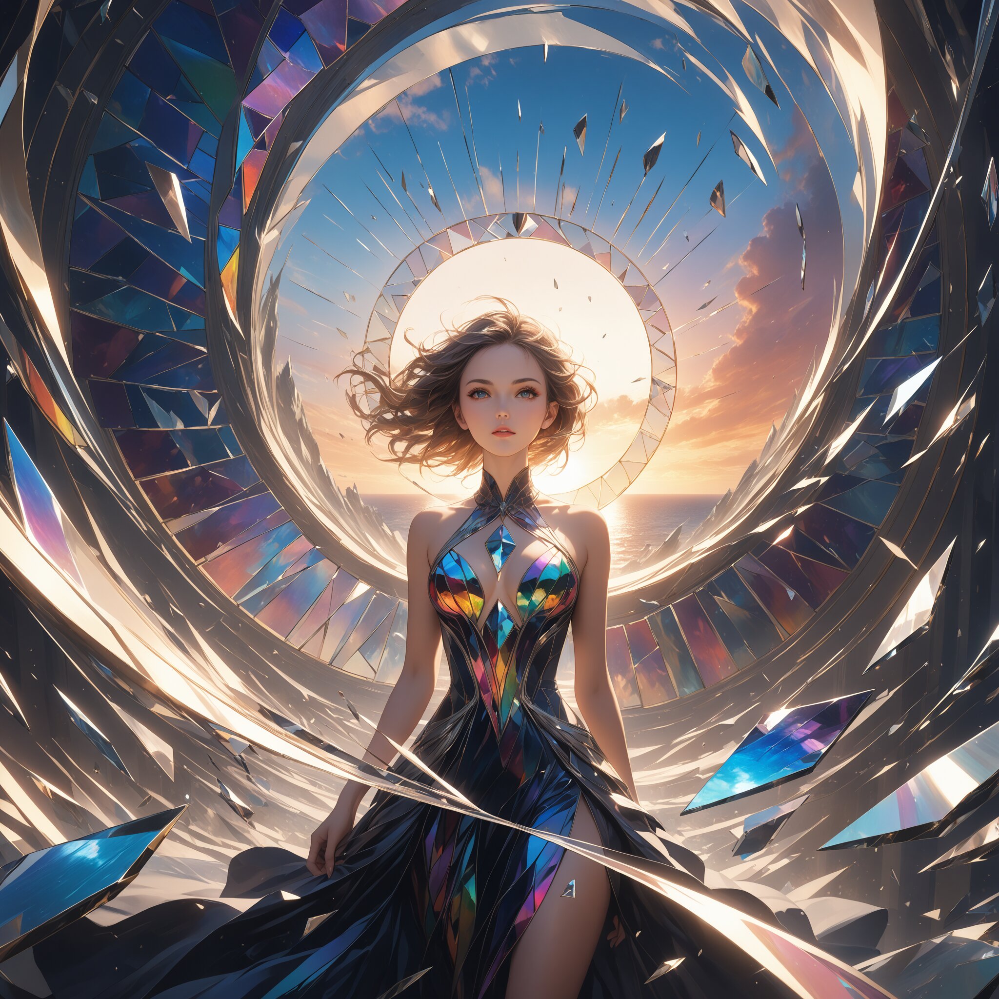 masterpiece, best quality, photorealistic, sharp focus, cinematic lighting, depth of field, beautiful composition, vibrant colors, ultra high res, 8K, highly detailed, masterpiece, best quality, very detailed, A dynamic wide-angle shot of a mystical woman whose body is composed of thousands of flying shards of mirrors and stained glass. The shards are swirling in a giant vortex, momentarily forming her beautiful face and torso. Through the gaps between the shards, a sunset sky with two moons is visible. The reflection on each shard shows a different timeline. Cinematic action shot, fractured composition, vibrant colors, iridescent reflections, dreamlike, masterpiece.