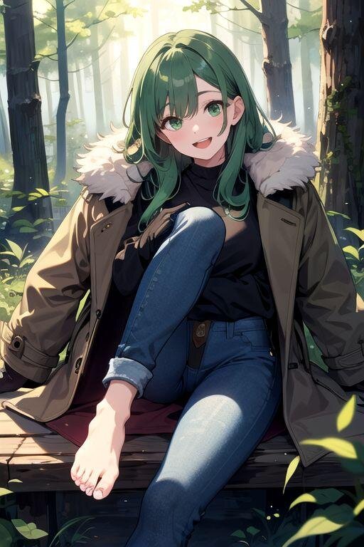 green hair, very long hair, green eyes, gloves, barefoot, (long toes:1.3), (long jeans:1.4),(coat:1.3),smile,open mouth, forest background