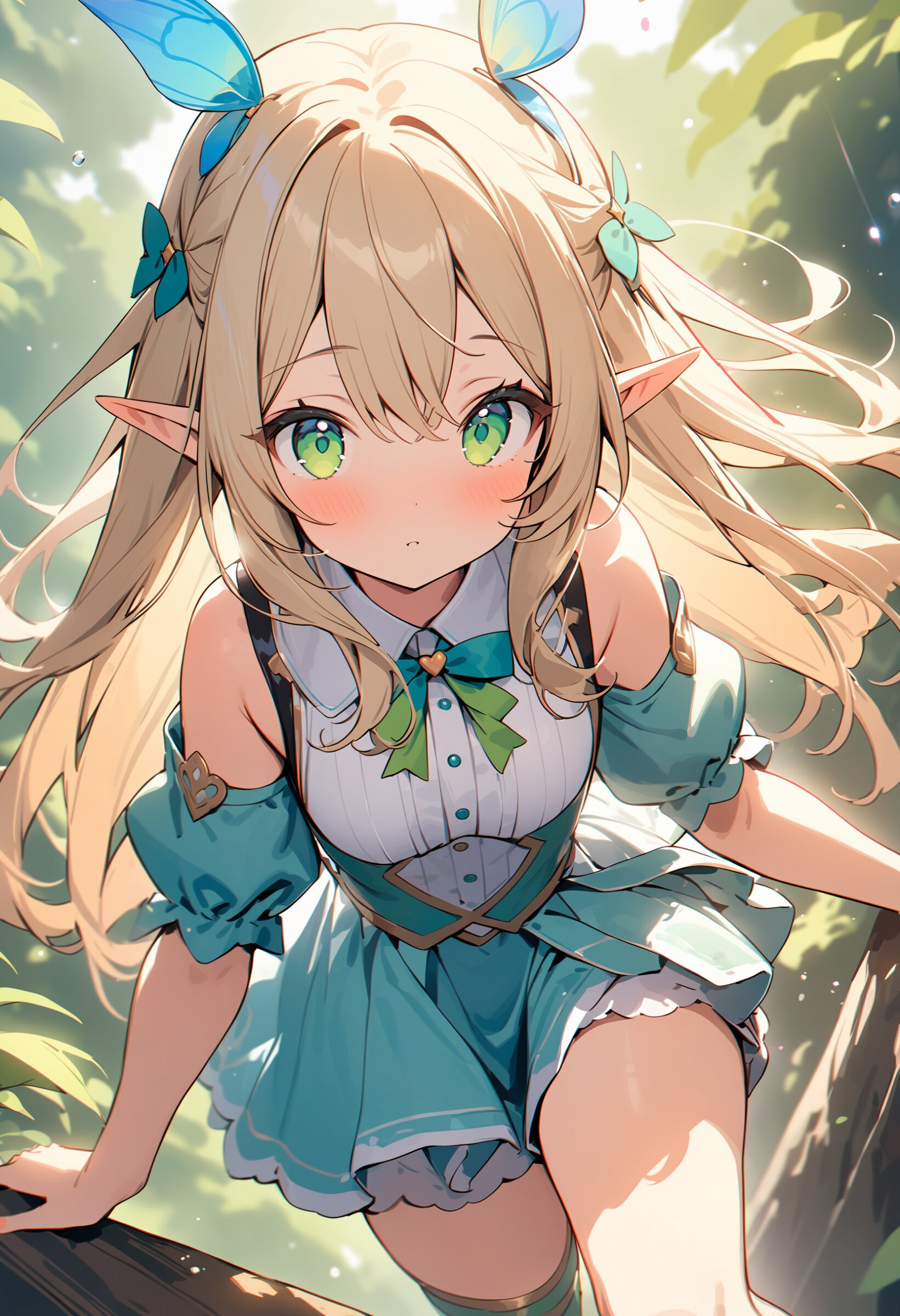 ((masterpiece)), ((best quality)), ((kawaii)), cute, (lovely), ((extremely detailed)), (beautiful), dynamic angle, a cute girl, 1girl, solo, ((elf)),beautiful blond hair, beautiful green eyes, ((beautiful eyes)), long hair, fantasy clothes,