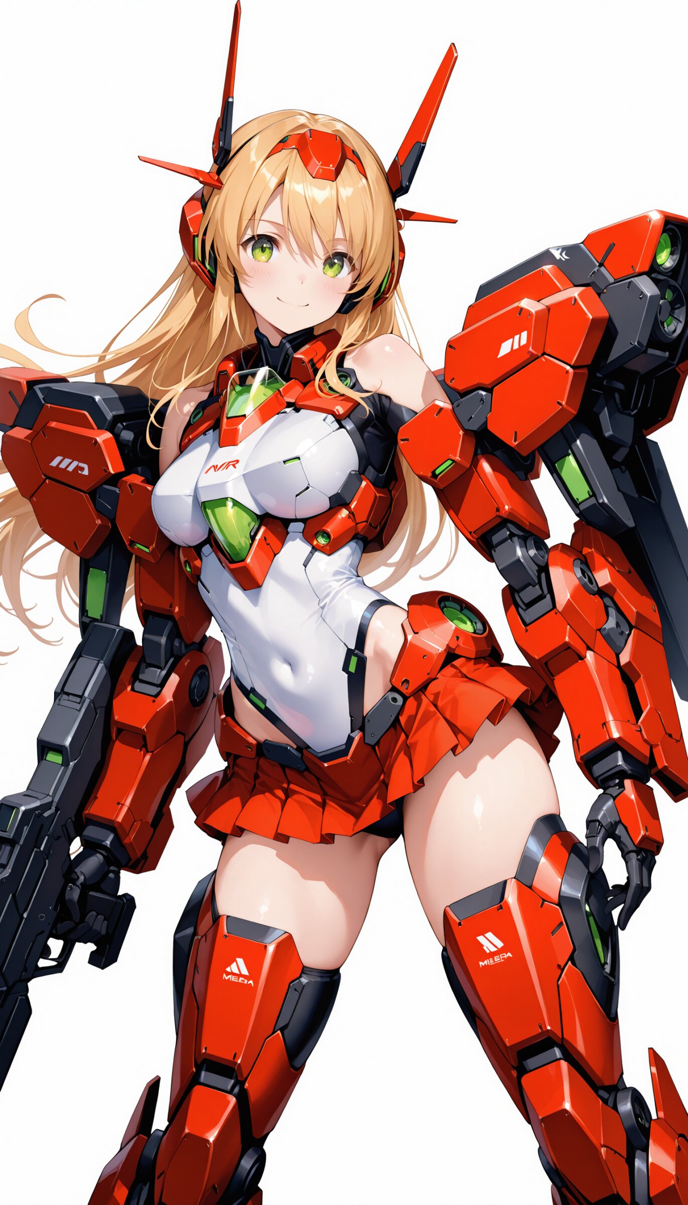1girl, ((white background)), ultra detailed 8k cg render, masterpiece, high resolution, extremely detailed, mecha musume,mecha shoulder, mech leg, headgear, mecha armor, ((mini skirt)),long blonde hair, dropping green eyes, smile, dynamic posing,