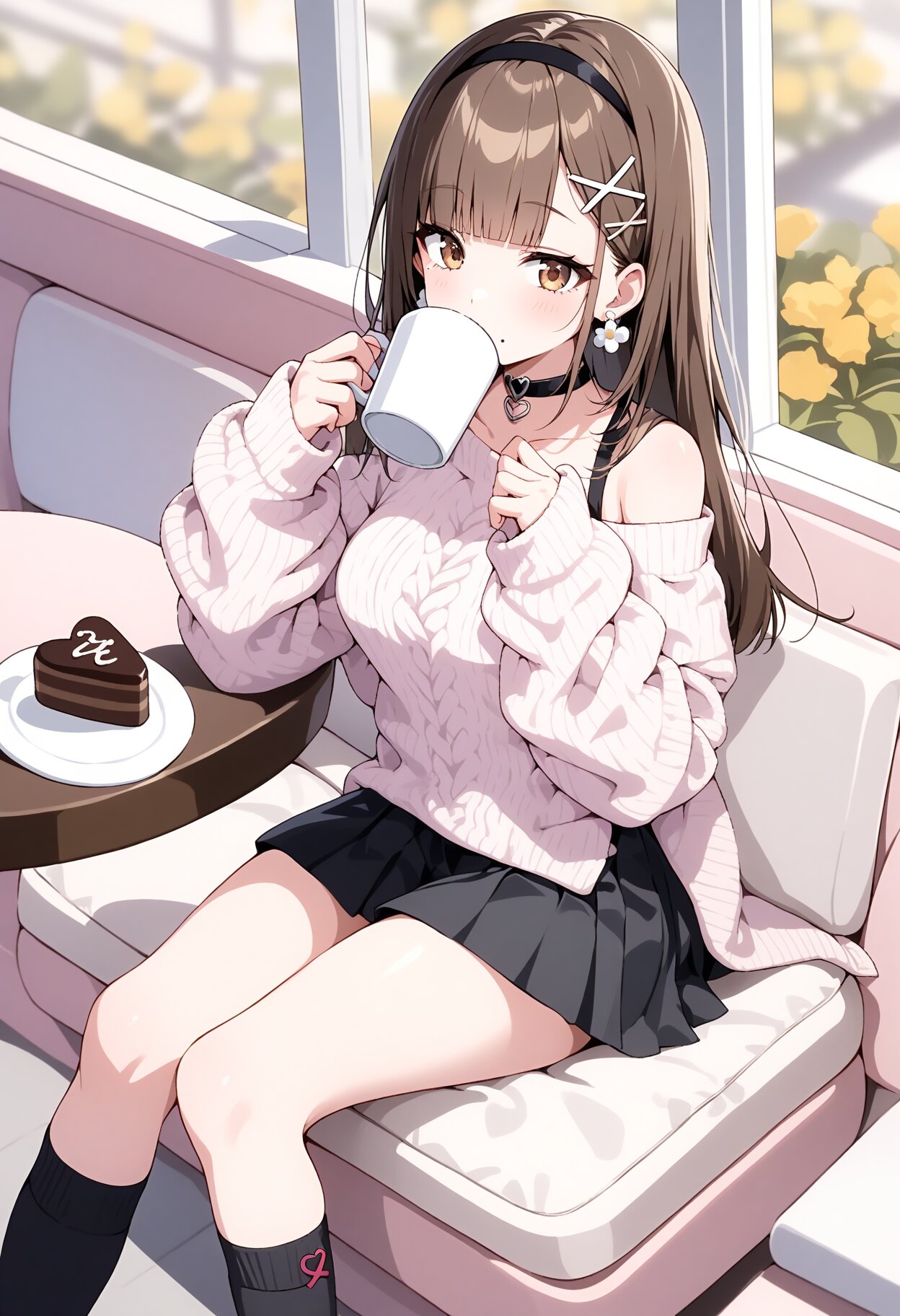 A fashion-focused anime-style illustration of a stylish teenage girl sitting casually at a cozy café seat, gently drinking coffee from a white ceramic mug. She wears a soft pastel pink oversized knit sweater, a high-waisted pleated mini skirt, black over-the-knee socks, and trendy sneakers, with a light winter coat and fluffy scarf styled neatly. On the table in front of her, a small plate holds several pieces of chocolate arranged neatly. Subtle natural movement as she lifts the mug, relaxed posture, soft daylight coming through the window, warm indoor atmosphere, shallow depth of field, emphasis on outfit coordination, fabric texture, and clothing folds, wholesome, elegant, detailed anime rendering.