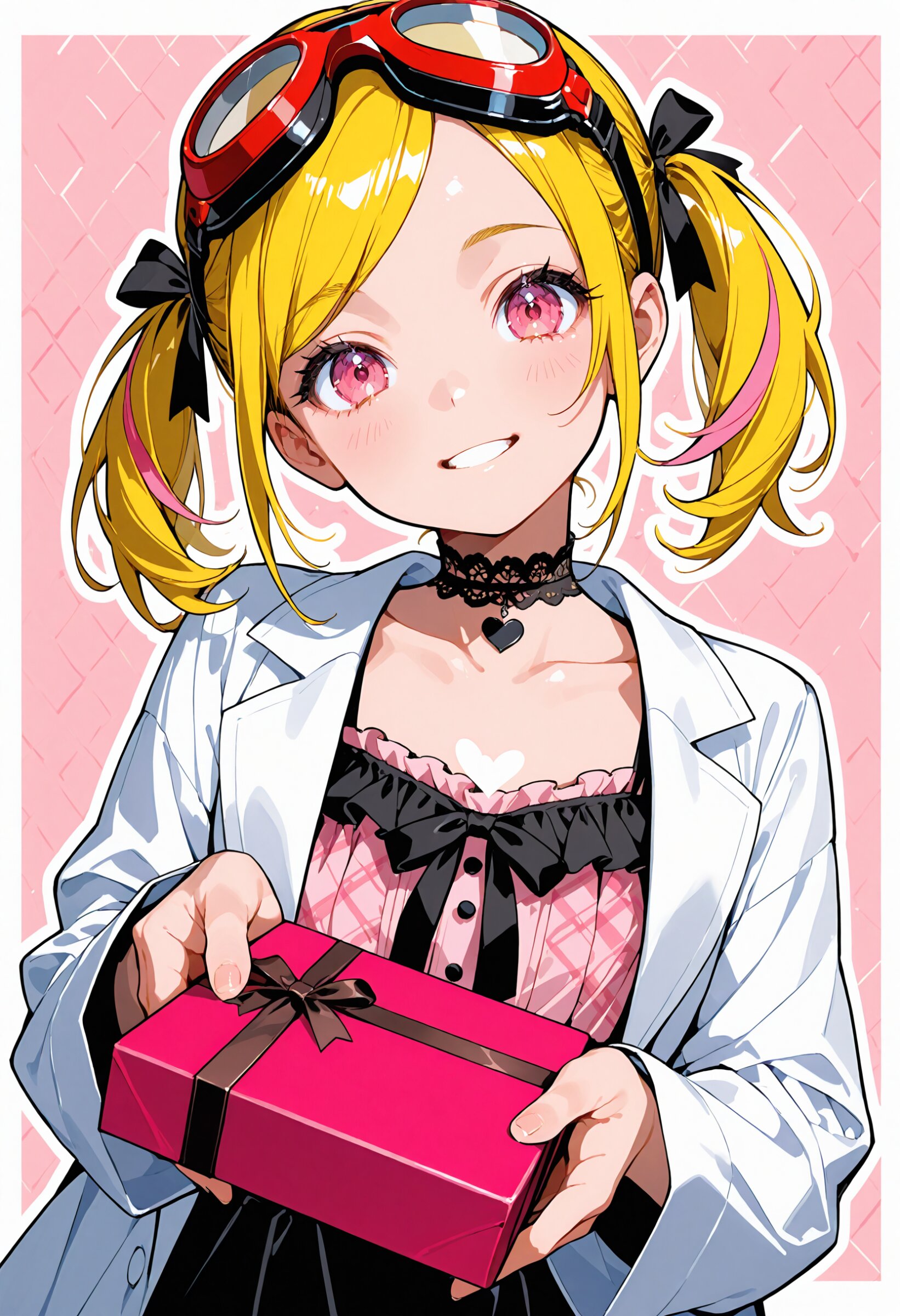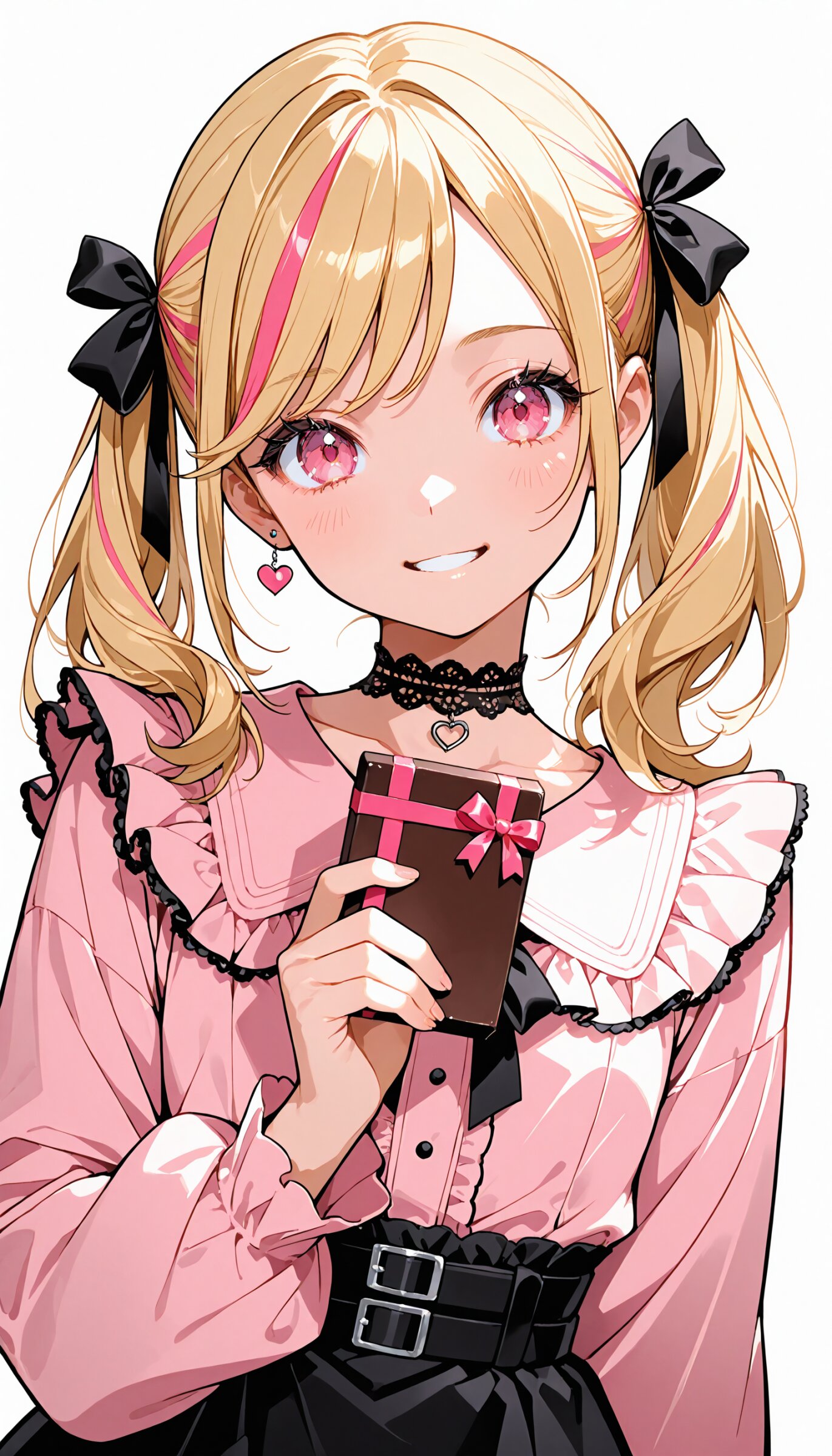 (rating: sensitive:1.2), score_9, score_8_up, score_7_up, score_6_up, source_anime, (delicate illustration), (watercolor style illustration, flat colors), (perspective, super dynamic angle from front, looking at viewer), diagonal view. 1girl, blonde hair, short twin-tails, swept bangs, (forehead), head tilt, (streaked hair, black and pink jirai-kei outfit, frilled blouse, lace choker, present a wrapped small chocolate gift ((towards)) with one hand), (Valentine's fashion illustration, sweety, ultra-intricate detailed), flat design, white outline, patterned fabric, beautiful composition, in the style of cute anime girl. BREAK insanely beautiful and detailed clothes, intricately hair, beautiful small face, long eyelashes, double eyelids, parted lips, smile, (kawaii, cute), flat chest, slender, {exquisitely delicate skin}, perfect anatomy, beautiful hand, perfect fingers, dynamic angle, dynamic pose, BREAK (DOF), sharp focus on the girl, emphasizing depth, realistic background. BREAK perfect AI rendering, three-quarter view. BREAK (masterpiece, aesthetic quality, 8K, ultra-detailed), (whimsical color palette, bold colors, flat colors), perfect design, amazing quality, high quality, absurdres, highres, natural lighting,