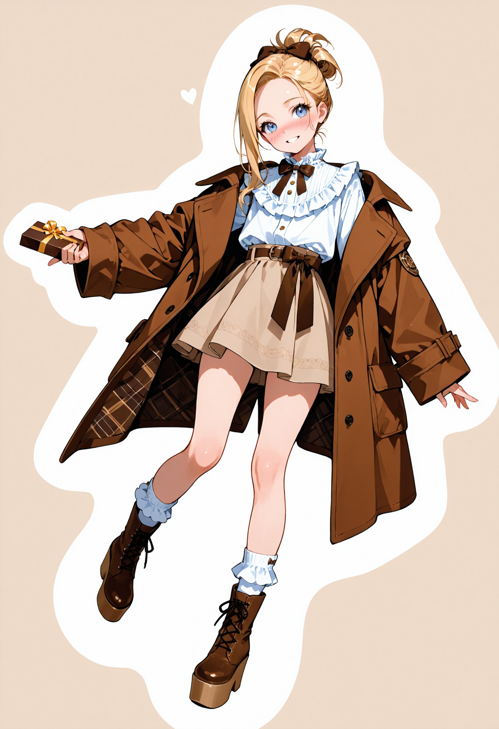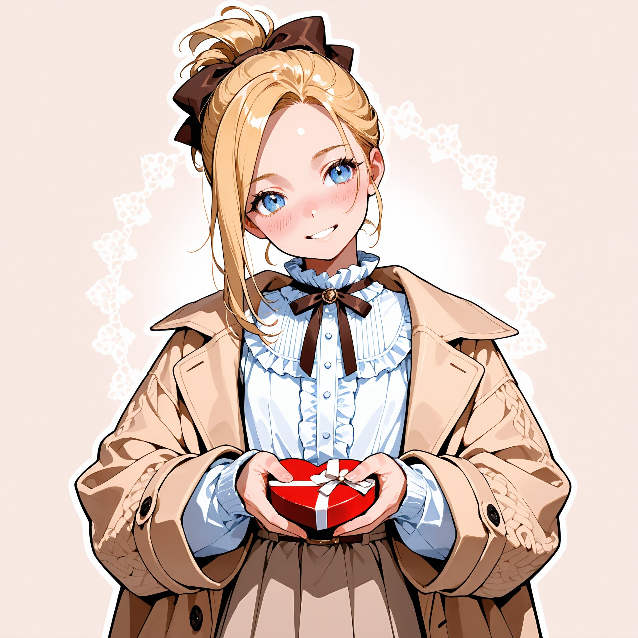 (rating: sensitive:1.2), score_9, score_8_up, score_7_up, score_6_up, source_anime, (delicate illustration), (watercolor style illustration, flat colors), (perspective, super dynamic angle from front, looking away), diagonal view. 1girl, blonde hair, blue eyes, swept bangs, (forehead), single sidelock, folded ponytail, silver barrette, nose blush, head tilt, (oversized knitted-coat with dark brown bow on sleeve, matching beige skirt with button, frilled blouse, present a wrapped small chocolate gift ((towards)) with both hands), ### 衣装プロンプトはお借りしました ### https://x.com/huku_ken_ai/status/2020102496388297132 (Valentine's fashion illustration, sweety, ultra-intricate detailed), flat design, white outline, patterned fabric, beautiful composition, in the style of cute anime girl. BREAK insanely beautiful and detailed clothes, intricately hair, beautiful small face, long eyelashes, double eyelids, parted lips, smile, (kawaii, cute), flat chest, slender, {exquisitely delicate skin}, perfect anatomy, beautiful hand, perfect fingers, dynamic angle, dynamic pose, BREAK (DOF), sharp focus on the girl, emphasizing depth, realistic background. BREAK perfect AI rendering, three-quarter view. BREAK (masterpiece, aesthetic quality, 8K, ultra-detailed), (whimsical color palette, bold colors, flat colors), perfect design, amazing quality, high quality, absurdres, highres, natural lighting,