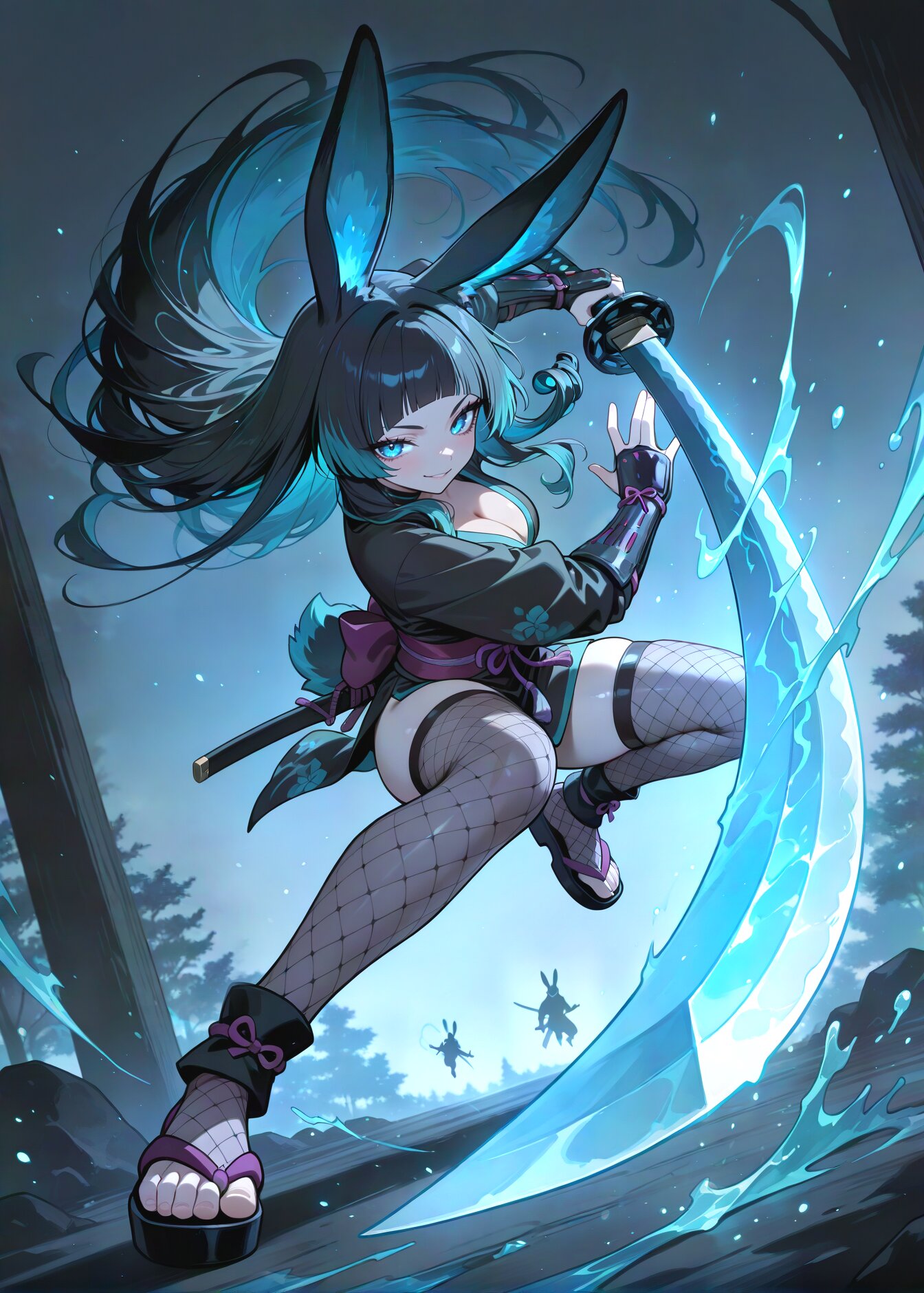 foreshortening, close to viewer looking at viewer, (dutch angle:1.2), weapon focus winter atmosphere, earthy color, glowing muted color maroon rabbit energy, muted color maroon silhouette of serious rabbit guardian, huge rabbit aura, 1girl, samurai, (muscular female:0.65), two-tone hair, maroon and bisque hair, extra long hair, Curl inward hair arched bangs , dyed bangs, ,, beautiful pale blue eyes framed breasts, ,, ninja cloth, short kimono, obijime, fishnet inner, fishnets, fishnet thighhighs, ninja pants,, kote, (ninjutsu:1.1), (holding ninja sword:1.1) half mask, , cleavage, zouri, ninja pants, rabbit ears, rabbit tail, ,, japanese clothes, seductive smile, dynamic pose, kung fu attack, kung fu action, kuji-in, ninjutsu, multiple weapons , katon, fire, embers, cremate, spark ignition, (swirling ink effects:1.2) jumping, midair, flexing, beautiful metallic luster, sharp katana, ultra detailed muted color maroon katana, silver particles, light trail, The background is a solid, bright muted color maroon, creating a striking contrast with the intricate, multi-colored design of the character, (fighting silhouette:1.0), pop color background, (high saturation:1.2), drop shadow, battle, duel, incoming attack, hitting, ink-drenched shadows, solid black shadow blocks, abstract ink swath background, heavy chiaroscuro, high-contrast inky shading, negative space, grunge texture, calligraphic strokes, super fine concept art, hard surface, graceful eyes, masterpiece, best quality, amazing quality, very aesthetic, absurdres, newest, professional art lots of details, , overexposure, sumie effect style, 4ur4_illu,shiny, glowing, glowing particles, glowing light particles, light particles, clear ice, <lora:noline (1):-0.5> <lora:sdxl2-flat2-512b:0.2> <lora:facelightup_xl_v10:0.5> <lora:V2_yakumo_alchemy:0.5> <lora:Aura_illu:0.1>