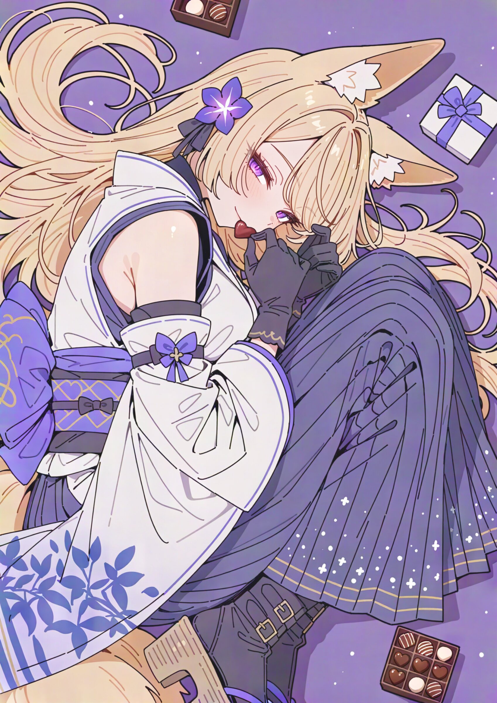from side, looking at viewer, from above, looking up, (close up:1.0), dynamic angle, looking at viewer, (simple transparent background:1.1), drop shadow, colored shadow, The background is a solid, bright muted color celadon, creating a striking contrast with the intricate, multi-colored design of the character, (ink wash effect:0.9), pop color background, (high saturation:1.2), winter coloring, winter atmosphere, 1girl, fox girl, gold Blond Hair, large breasts and fox ears, (swept bangs:1.2), (perfect purple eyes:1.3) long eyelashes aristocratic features tall girl has (Blond Hair long hair over ears:1.3) fox 9tails, (wearing White Japanese Cloth straw sandal leather gloves long skirt Obi boots:1.3), hair ornament flower, tabi, winter scarf, (fur trim:1.1), black thighhighs, detached sleeves, mysterious atmosphere, seductive smile, closed eyes, comfy, holding chocolate, heart-shaped chocolate, gift box, ribbon fidgeting fetal position head tilt, muted color celadon theme, super fine concept art, hard surface, graceful eyes, masterpiece, best quality, amazing quality, very aesthetic, absurdres, newest, professional art lots of details, , overexposure, sumie effect style, 4ur4_illu,shiny, glowing, glowing particles, glowing light particles, light particles, peat, <lora:noline (1):-0.5> <lora:sdxl2-flat2-512b:-0.2> <lora:facelightup_xl_v10:0.5> <lora:V2_yakumo_alchemy:0.5> <lora:Aura_illu:0.1>