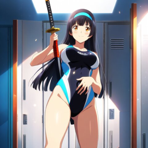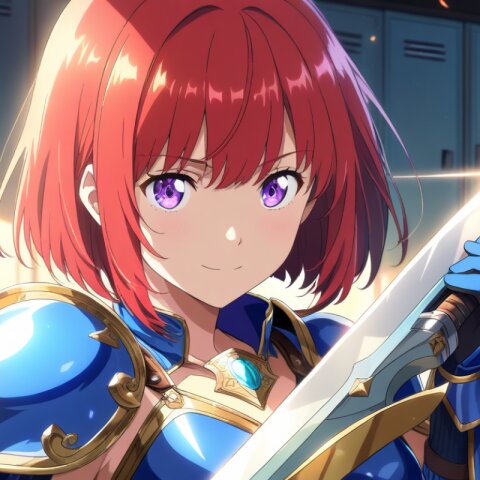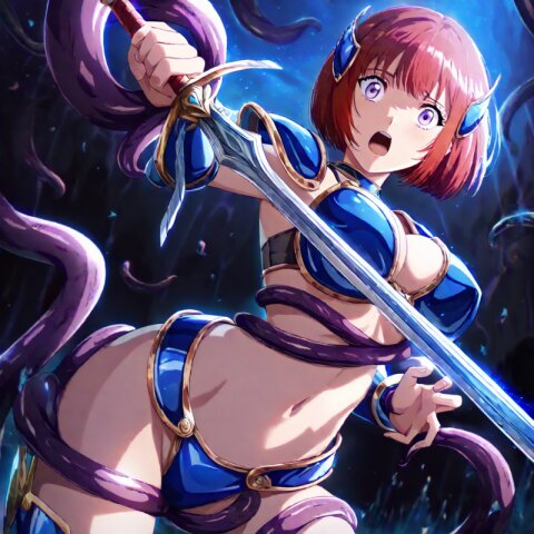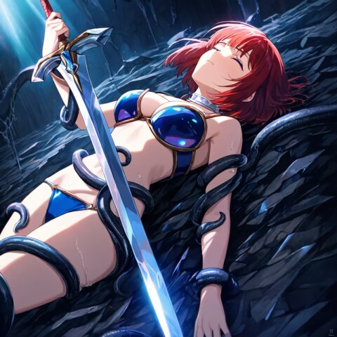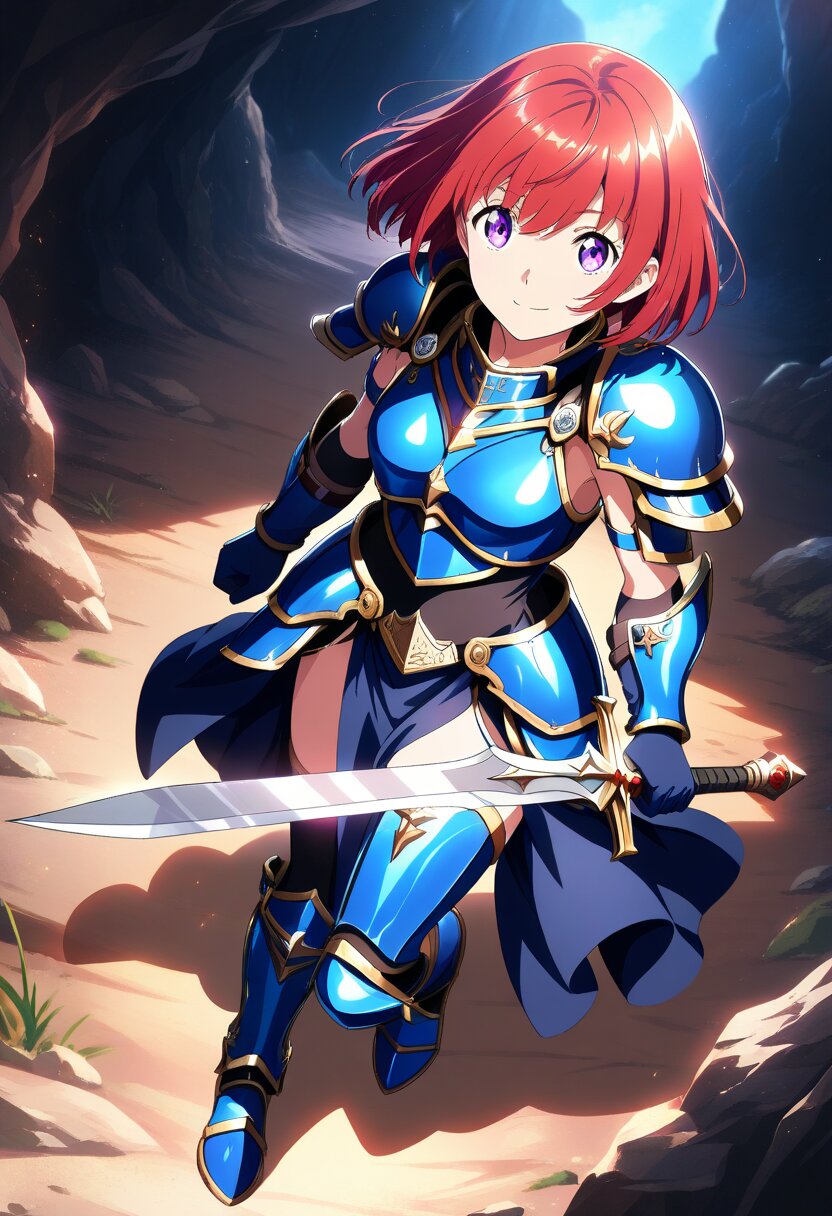 ((masterpiece)), ((best quality)), (ultra-detailed), anime style, full body,dark cave, a cute girl, 1girl, solo, (((armor))),blue bikini armor ,((warrior)), beautiful red hair, beautiful purple eyes, ((beautiful eyes)), short hair, bob cut, Holding a weapon in hand, gripping Sword,little smile