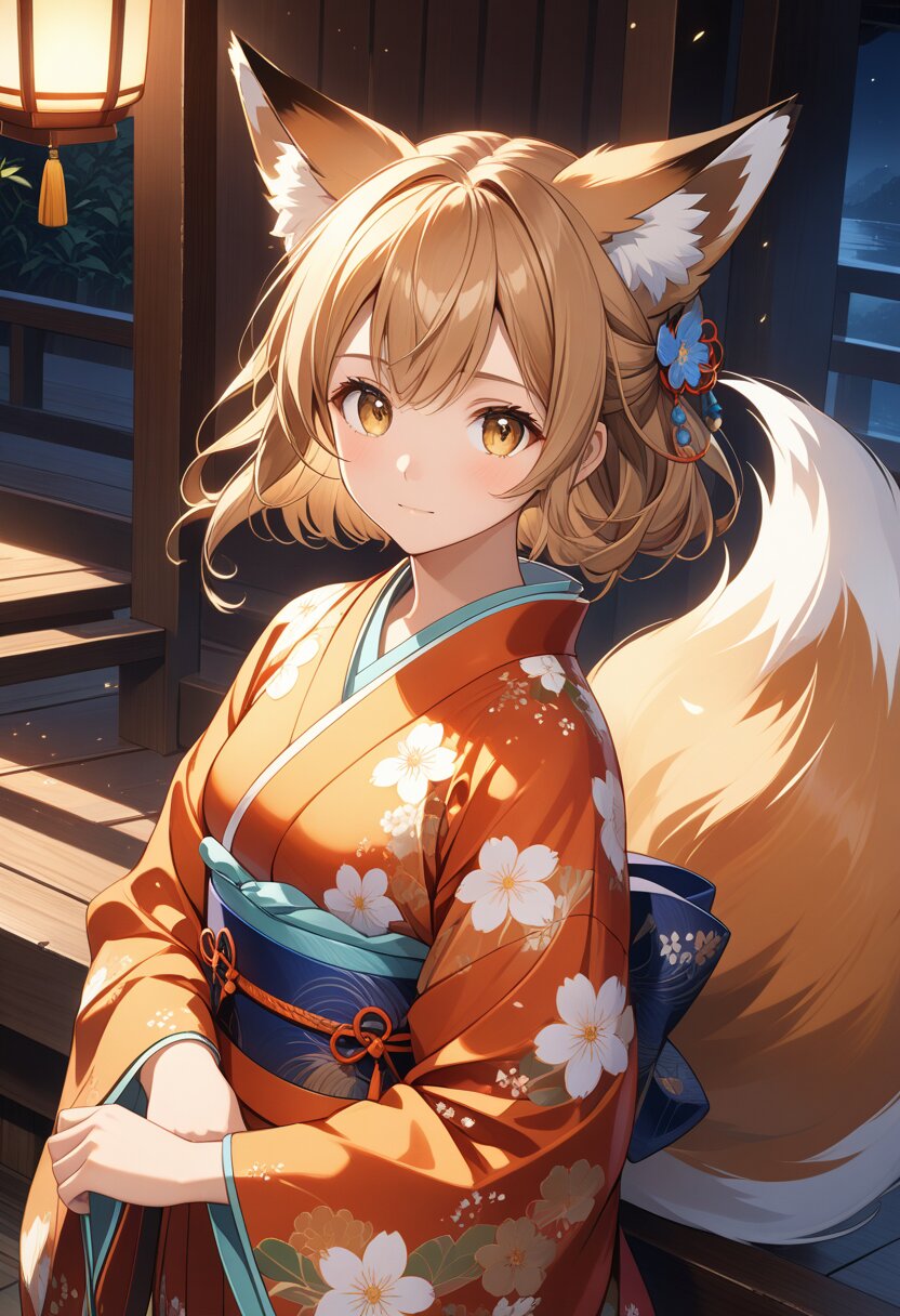 (high resolusion,illustration,ultra detailed 8k art,extremely detailed CG,official art,clothes reflecting light,detailed shiny skin,detailed background:1.3), ((highly detailed beautiful face and eyes),anime_style, fox_ears, girl, light_brown_hair, double_eyelids, long_eyelashes, fluffy_tail, kimono, geta_sandals, soft_lighting, expressive_eyes, delicate_features, traditional_atmosphere, graceful_pose
