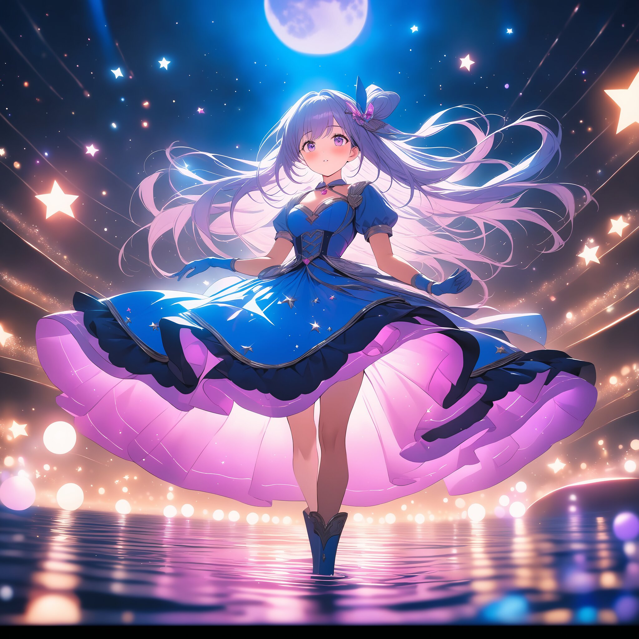 masterpiece, best quality, photorealistic, sharp focus, cinematic lighting, depth of field, beautiful composition, vibrant colors, ultra high res, 8K, highly detailed, masterpiece, best quality, very detailed, Anime style, magical girl floating in a sea of glowing stars and floating ribbons, intricate frilled dress, fluttering long hair with hair accessories, dreamy atmosphere, vibrant blue and purple color palette, sparkles and bokeh everywhere, looking up at the moon, cinematic lighting, stunning visuals, trending on Pixiv, high detail.