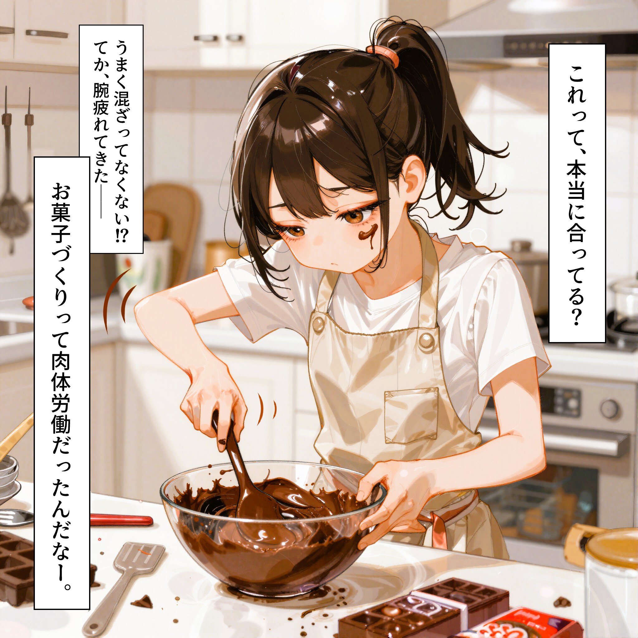 Scene: A 16-year-old girl is making handmade Valentine’s chocolate in a modern kitchen. Character: A teenage girl around 16 years old, wearing a practical apron over her casual clothes. Her hair is tied up in a ponytail, giving her a neat and energetic appearance. She is focused intensely on mixing melted chocolate in a large bowl. A small splatter of chocolate is stuck on her cheek, and additional smudges are visible on her hands and forearms, showing how hard she’s been working. Action: She leans forward and stirs the chocolate vigorously with both hands, fully absorbed in the process. Her expression shows determination and effort as she works on her homemade chocolates. Environment: A bright, contemporary system kitchen. Baking tools, molds, spatulas, and partially used chocolate bars are scattered across the counter. The workspace is lively and a bit messy, reflecting her earnest effort. Style: Warm, soft anime-style illustration with gentle shading. A sweet, Valentine-themed color palette. Glossy highlights on the chocolate for a realistic, appetizing look. Mood: Heartwarming, earnest, slightly comedic. A mix of teenage sincerity, effort, and adorable clumsiness. Technical: Medium-distance shot showing her upper body, the mixing bowl, and the messy countertop. Slight angle to capture her ponytail, apron, and the chocolate smudges on her cheek, hands, and arms.