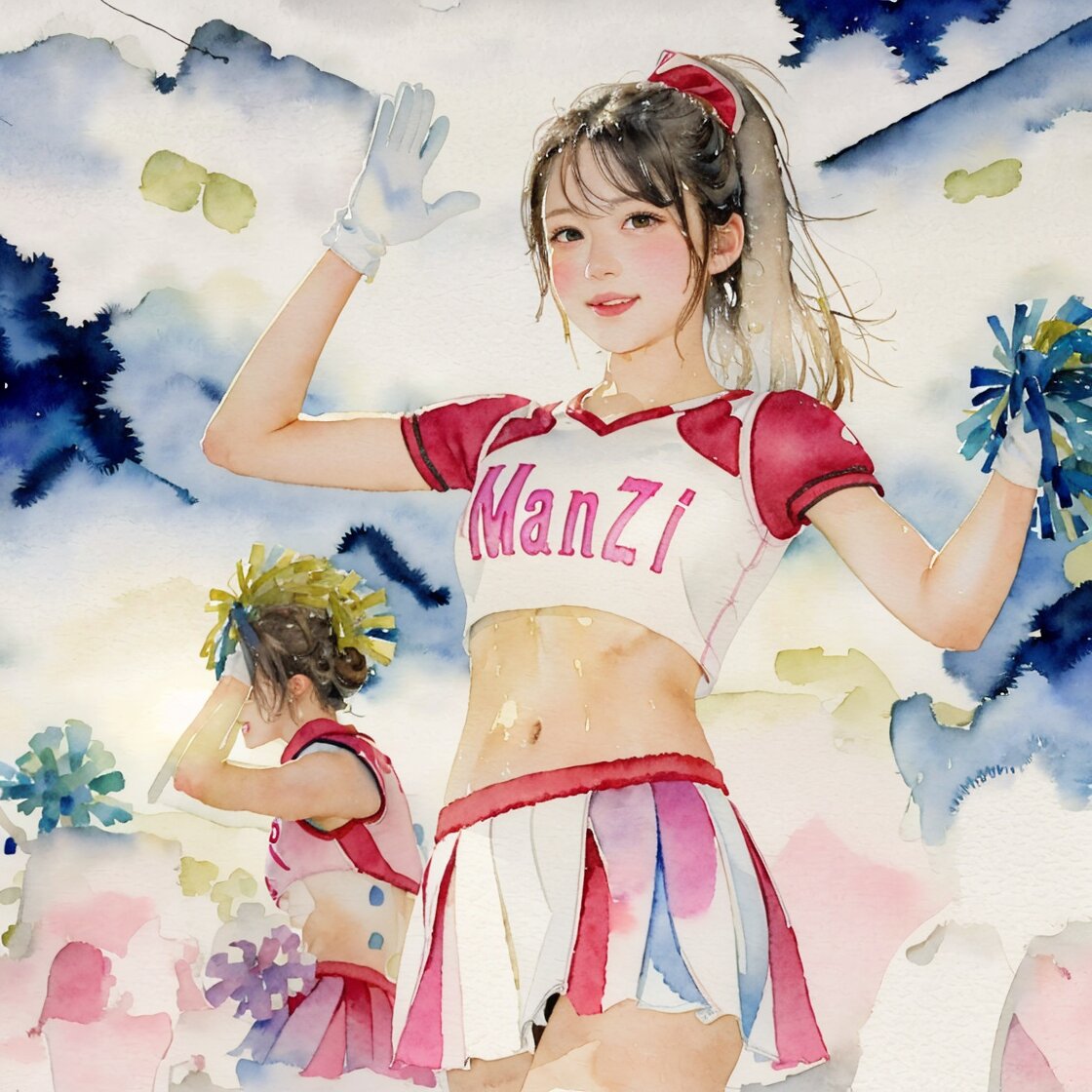best quality, masterpiece, (watercolor painting:1.45), (line art:1.2), (illustration:1.1), (cel anime:1.0) 1 girl,detailed face,beautiful detailed eyes, half updo, baseball stadium:1.6, (night:1.3), (crowd:1.5), (looking at viewer:1.3), (rain:1.2), (wet hair:1.2), (Water Splash:1.0), (cheerleader uniform:1.4), (cheerleader outfit:1.2), (white gloves:1.2), (smile:0.8),pleated skirt:1.2,