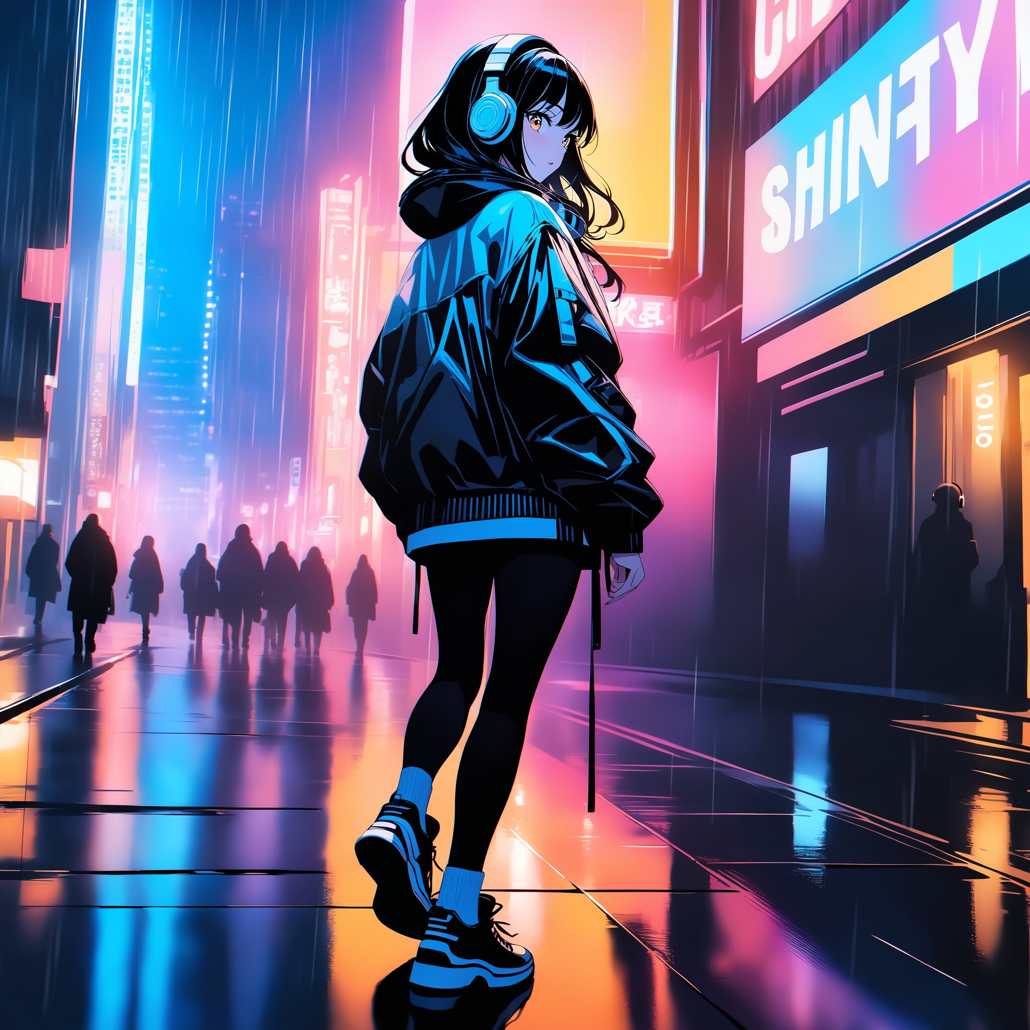 masterpiece, best quality, photorealistic, sharp focus, cinematic lighting, depth of field, beautiful composition, vibrant colors, ultra high res, 8K, highly detailed, masterpiece, best quality, very detailed, Anime style, stylish cool girl walking in a neon city at night, looking back over her shoulder, wearing trendy techwear and sneakers, headphones around her neck, vibrant neon signs background, rainy street with reflections, sharp lines, high contrast, cinematic shadows, cool aesthetic, masterpiece, 4k.