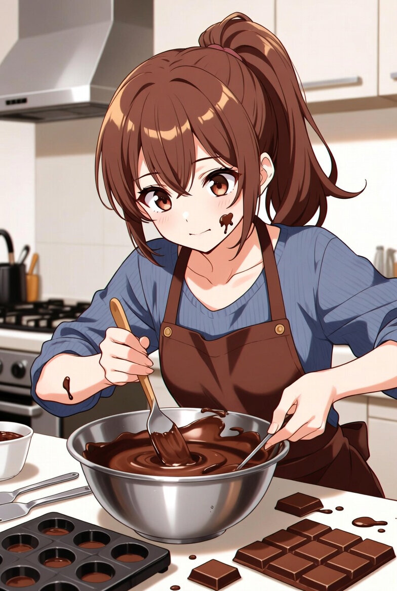 Scene: A 16-year-old girl is making handmade Valentine’s chocolate in a modern kitchen. Character: A teenage girl around 16 years old, wearing a practical apron over her casual clothes. Her hair is tied up in a ponytail, giving her a neat and energetic appearance. She is focused intensely on mixing melted chocolate in a large bowl. A small splatter of chocolate is stuck on her cheek, and additional smudges are visible on her hands and forearms, showing how hard she’s been working. Action: She leans forward and stirs the chocolate vigorously with both hands, fully absorbed in the process. Her expression shows determination and effort as she works on her homemade chocolates. Environment: A bright, contemporary system kitchen. Baking tools, molds, spatulas, and partially used chocolate bars are scattered across the counter. The workspace is lively and a bit messy, reflecting her earnest effort. Style: Warm, soft anime-style illustration with gentle shading. A sweet, Valentine-themed color palette. Glossy highlights on the chocolate for a realistic, appetizing look. Mood: Heartwarming, earnest, slightly comedic. A mix of teenage sincerity, effort, and adorable clumsiness. Technical: Medium-distance shot showing her upper body, the mixing bowl, and the messy countertop. Slight angle to capture her ponytail, apron, and the chocolate smudges on her cheek, hands, and arms.