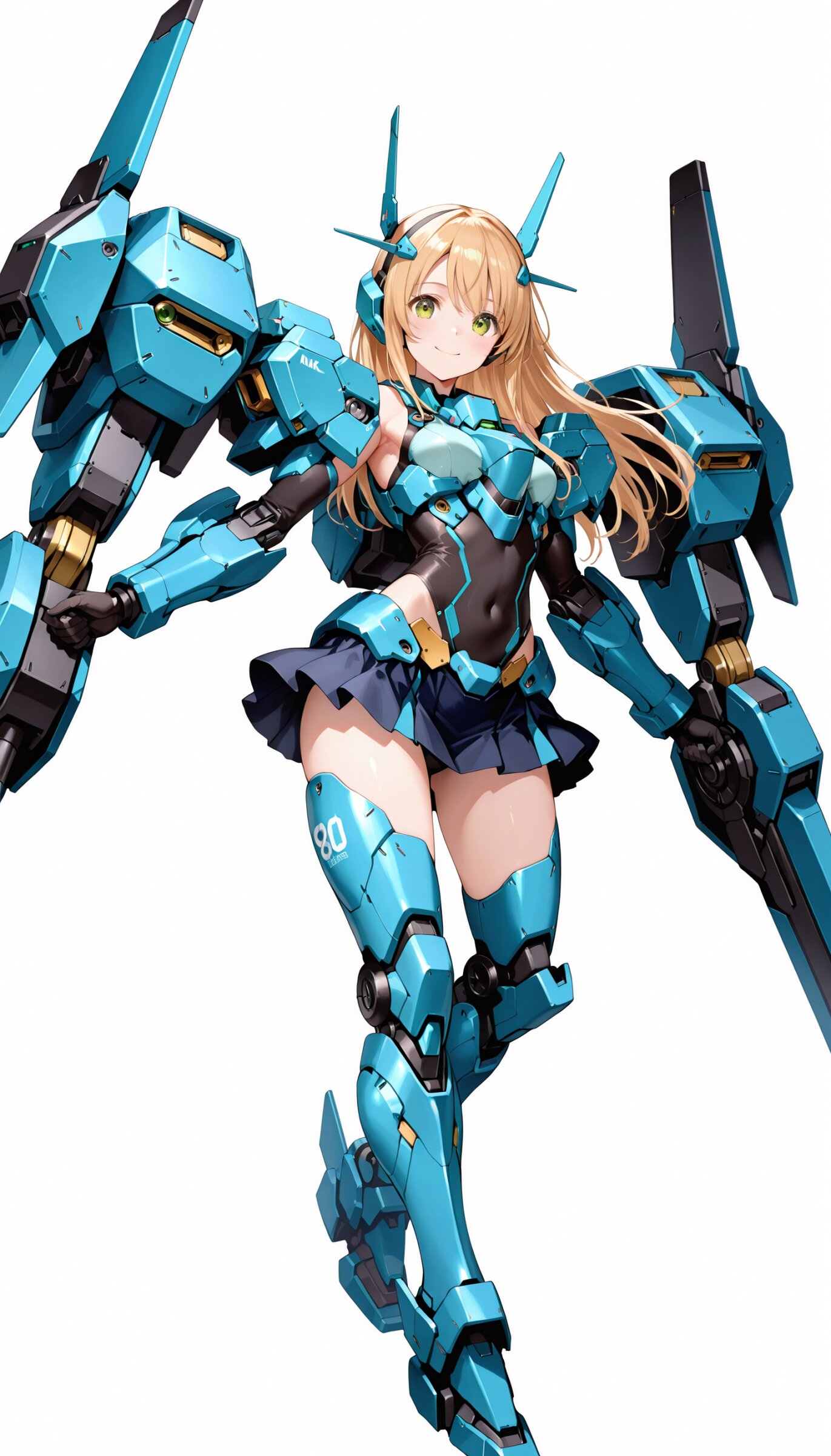 1girl, ((white background)), ultra detailed 8k cg render, masterpiece, high resolution, extremely detailed, mecha musume,mecha shoulder, mech leg, headgear, mecha armor, ((mini skirt)),long blonde hair, dropping green eyes, smile, dynamic posing,