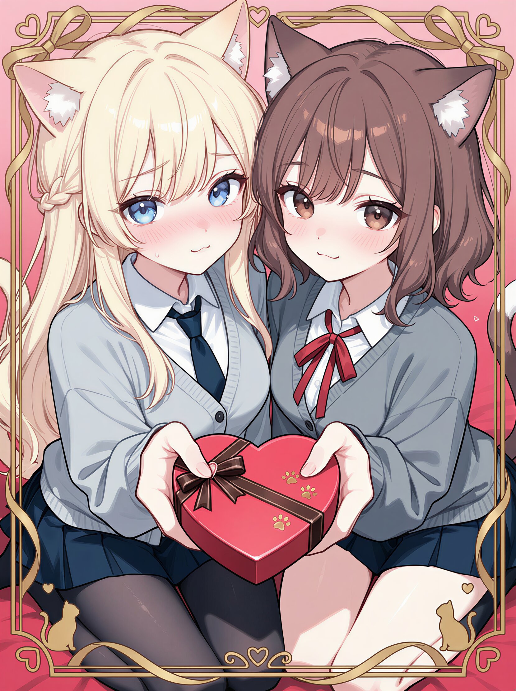 ※肉球とフレームはbanana proで後付け (masterpiece, best quality, high resolution, anime illustration, soft colors, gentle lighting, smooth shading, clean illustration), two cat-eared girls, valentine illustration, POV perspective, slight top-down angle, both looking up at viewer, strong eye contact, offering a beautifully wrapped Valentine chocolate box toward camera, foreshortened chocolate in foreground, close distance, soft intimate mood, slight inward knees, shoulders slightly touching, BREAK (girl A:1.15), left side, blue eyes, long blonde hair, hair between eyes, braid, natural small cat ears, natural cat tail, medium breasts, subtle watery eyes, :<, furrowed brow, nose blush, grey cardigan over white shirt, navy slim necktie, short pleated skirts, black tights, thighs visible, BREAK (girl B:1.15), right side, chestnut brown wavy bob hair, brown eyes, natural small cat ears and tail, medium breasts, :3, gentle blush, smile, grey cardigan over white shirt, red ribbon, short pleated skirts, black tights, thighs visible, BREAK distinct faces, different hairstyles, balanced composition, BREAK rose gradient background, minimal background, high detail, delicate shading, romantic atmosphere, pastel colors