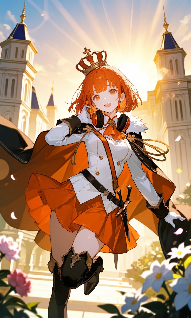 1girl, solo, a cheerful young woman with short orange hair styled in a bob cut and bright orange eyes stands in a dynamic pose outside a grand palace with modern architecture. She has a delicate face with detailed skin and hair, wearing (White luxurious Prince costume:1.6) with long sleeves, (luxurious Black Cape:1.3), and an (luxurious Orange mini skirt:1.4). Her accessories include (luxurious Black Boots:1.3), (luxurious White Gloves:1.3), a (dagger on waist:1.3), and a (luxurious crown on head:1.4). Headphones rest gently around her neck. She has an open mouth with a light smile, exuding charm and confidence. The background features a romantic academia atmosphere with flowers in bloom, bathed in golden hour sunlight, sunbeams, and lens flare during sunset. The style is insanely detailed, masterpiece quality with beautiful 16k resolution, emphasizing delicate textures in her hair, clothes, and surroundings.
