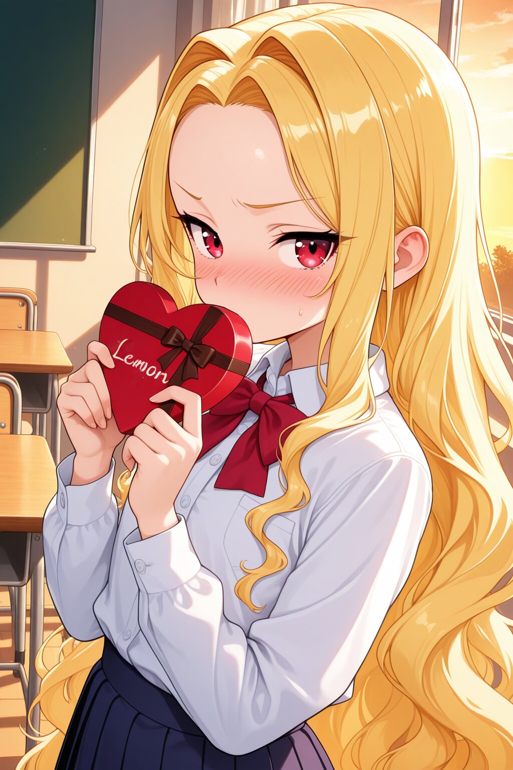 1girl, classroom,(sunset), (tall:1.3),(young),slender,slender small face, flat chest, (lemon yellow hair),absurdly long hair,(small forehead),(hair intakes:1.3),wavy hair,sideburns, (garnet red eyes),Jig eyes,(tsurime),sideways glance, nose blush,Tsundere,uneasy,nervous, school uniform,(white collared shirt:1.2),(dark blue skirt:1.3),red bow,long sleeve, holding valentine's day heart chocolate,hands up, upper body,dynamic angle,from side:0.8,looking afar,lokking to the side,looking side, ((best quality)),amazing quality,((very high resolution)),very aesthetic,((ultra detailed)),absurdres, full color,extremely detailed CG,super fine illustration, perfect anatomy,perfect hands,super detailed skin, anime style,