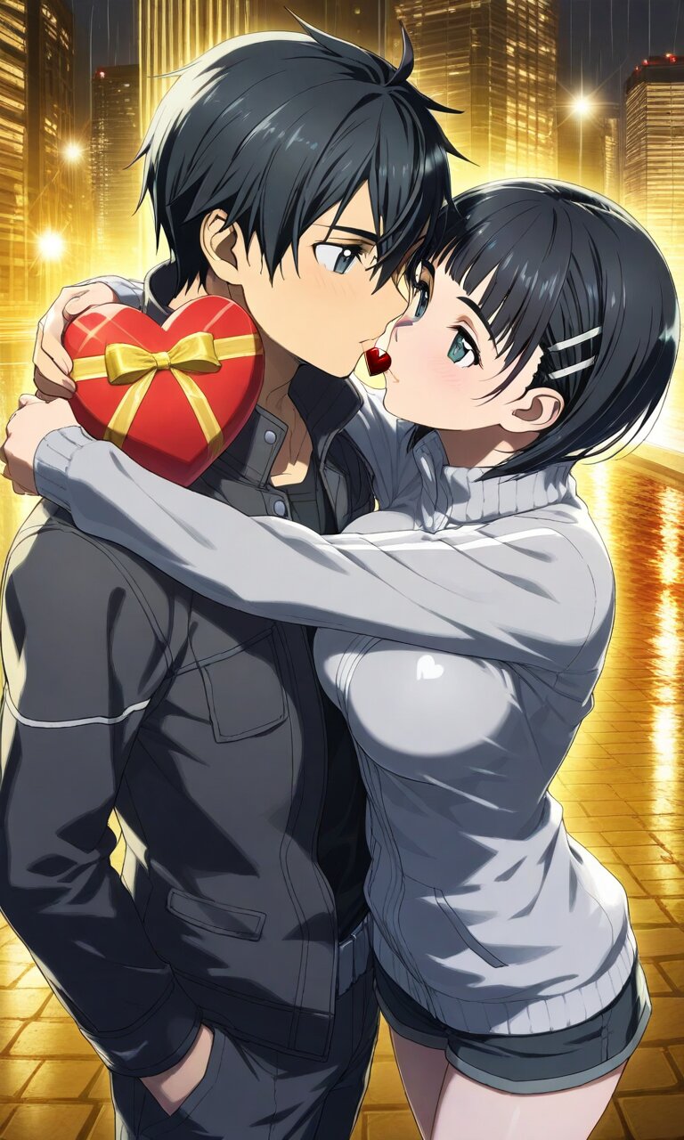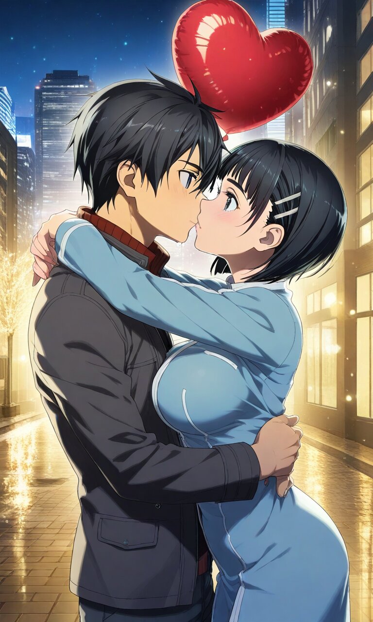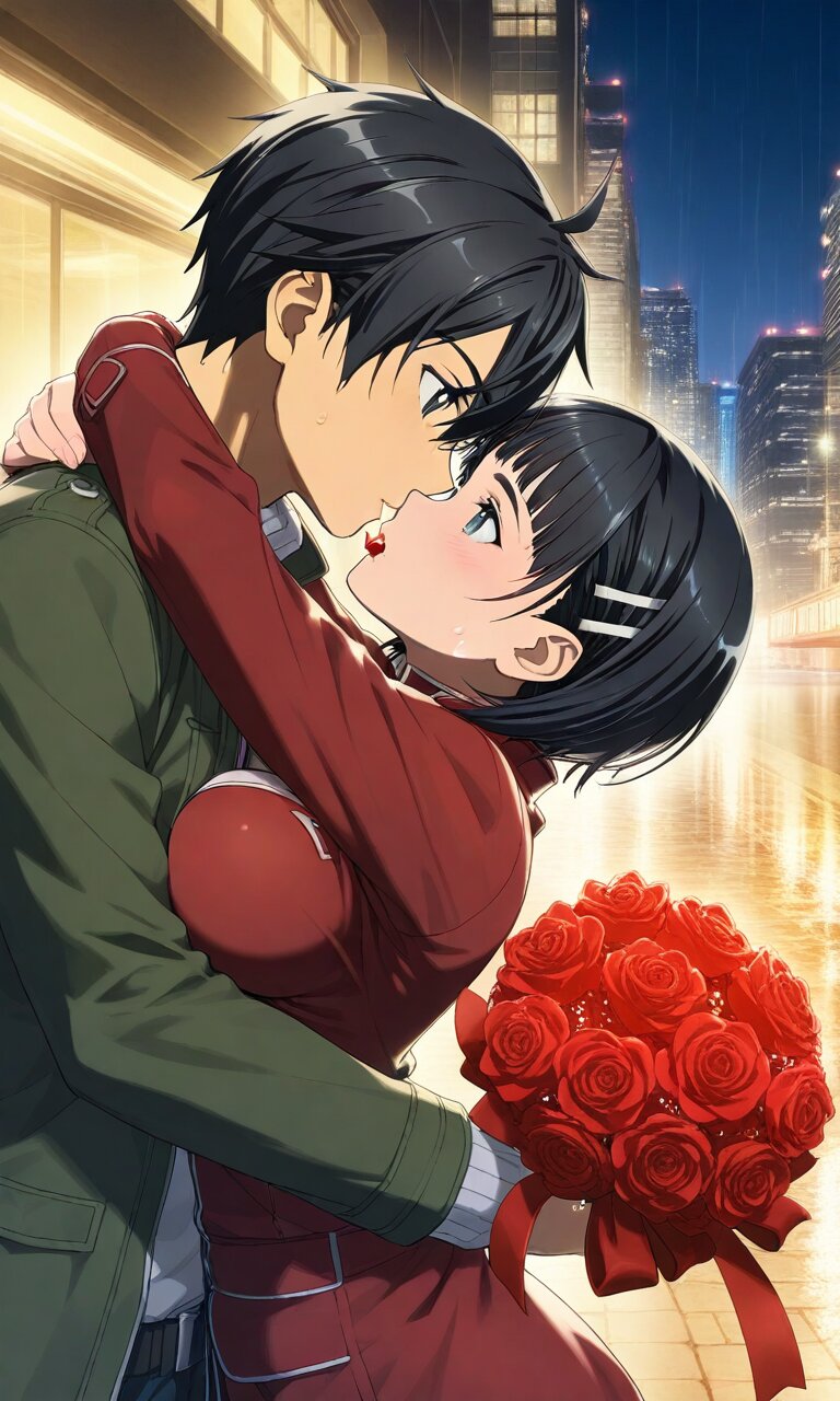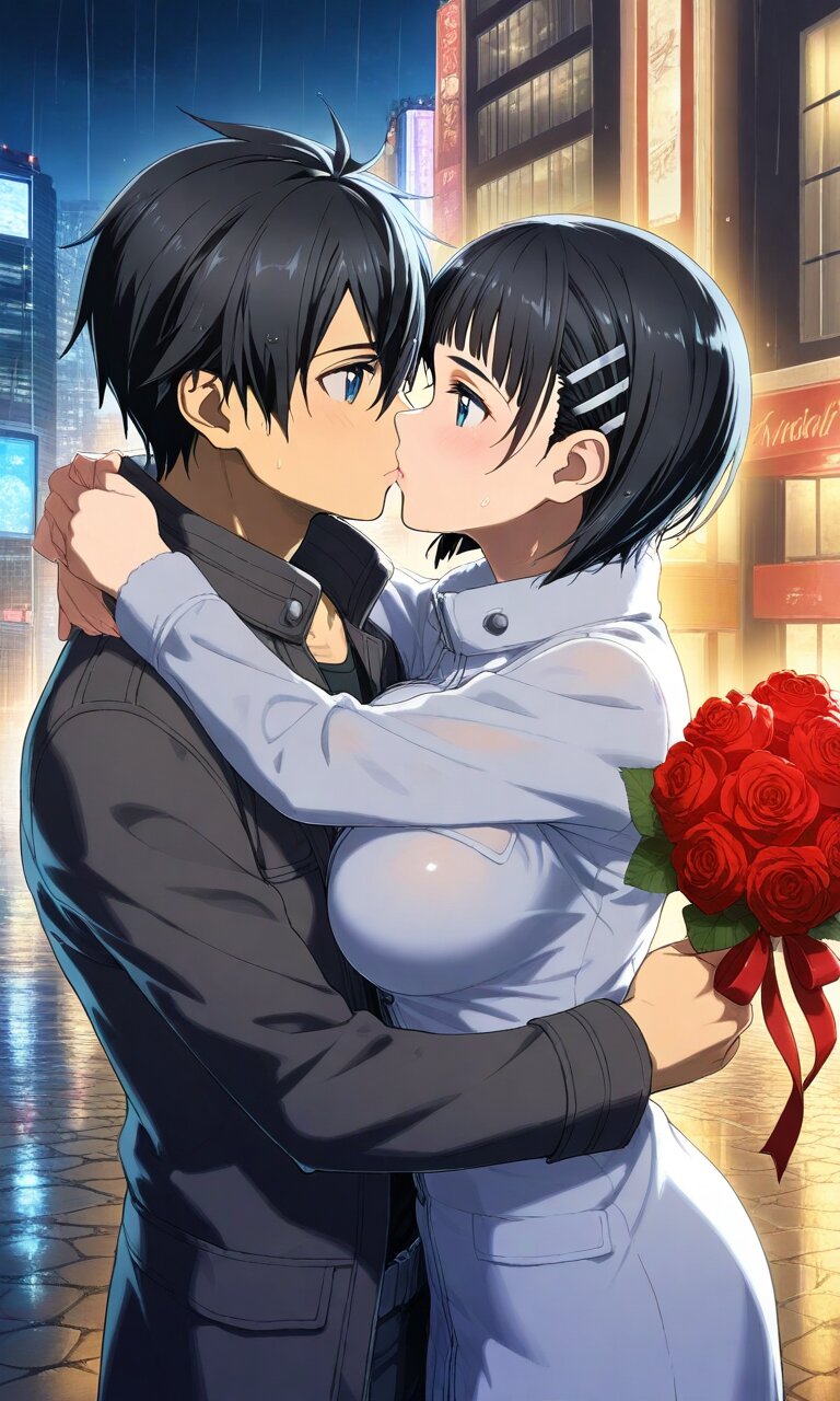 Couple, boy and girl, two people only,absurdres, ultra-detailed, master piece, high resolution, 8k, Boy, girl, couple, Romantic young couple embracing under city night lights on Valentine's Day, gentle kiss, red roses in her hand, heart-shaped balloons floating nearby, fairy lights and neon glow in background, rain reflections on wet pavement, passionate yet tender moment, ultra detailed faces, cinematic lighting, dramatic shadows, photorealistic, 8k, high resolution BREAK the boy(original boy,black hair,short hair, black eyes) BREAK the girl(suguha, short hair, hairclip, large breasts,, )
