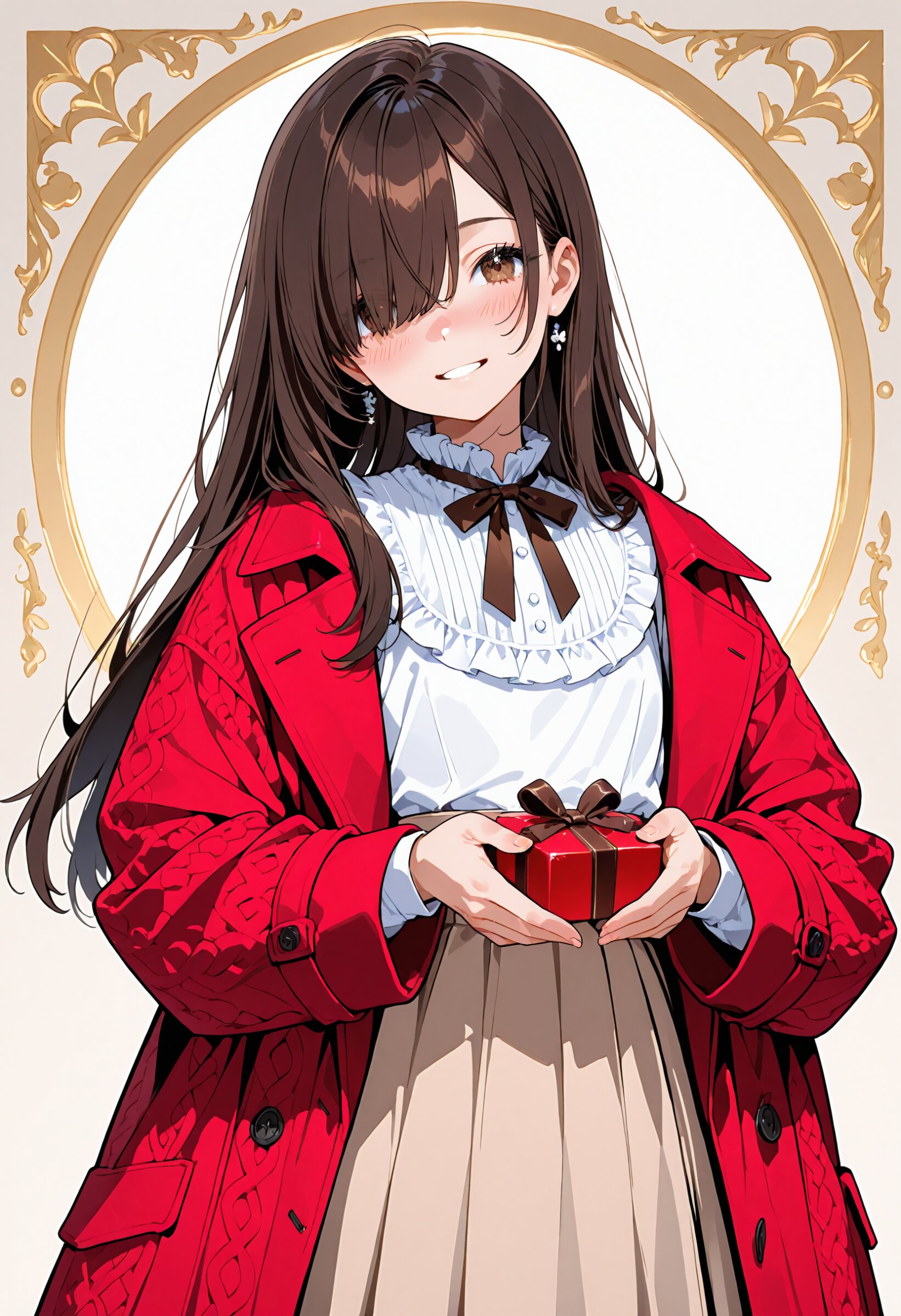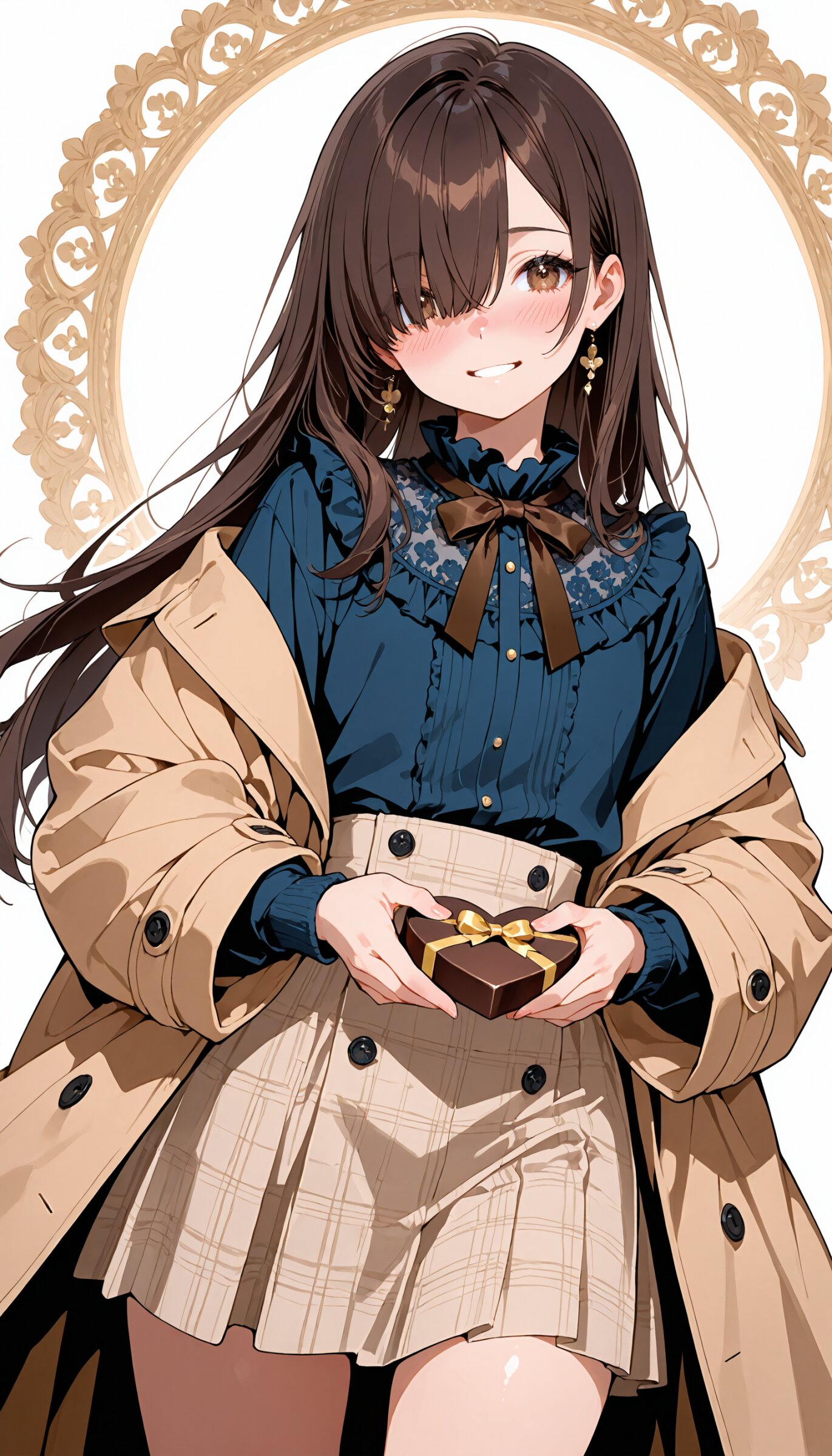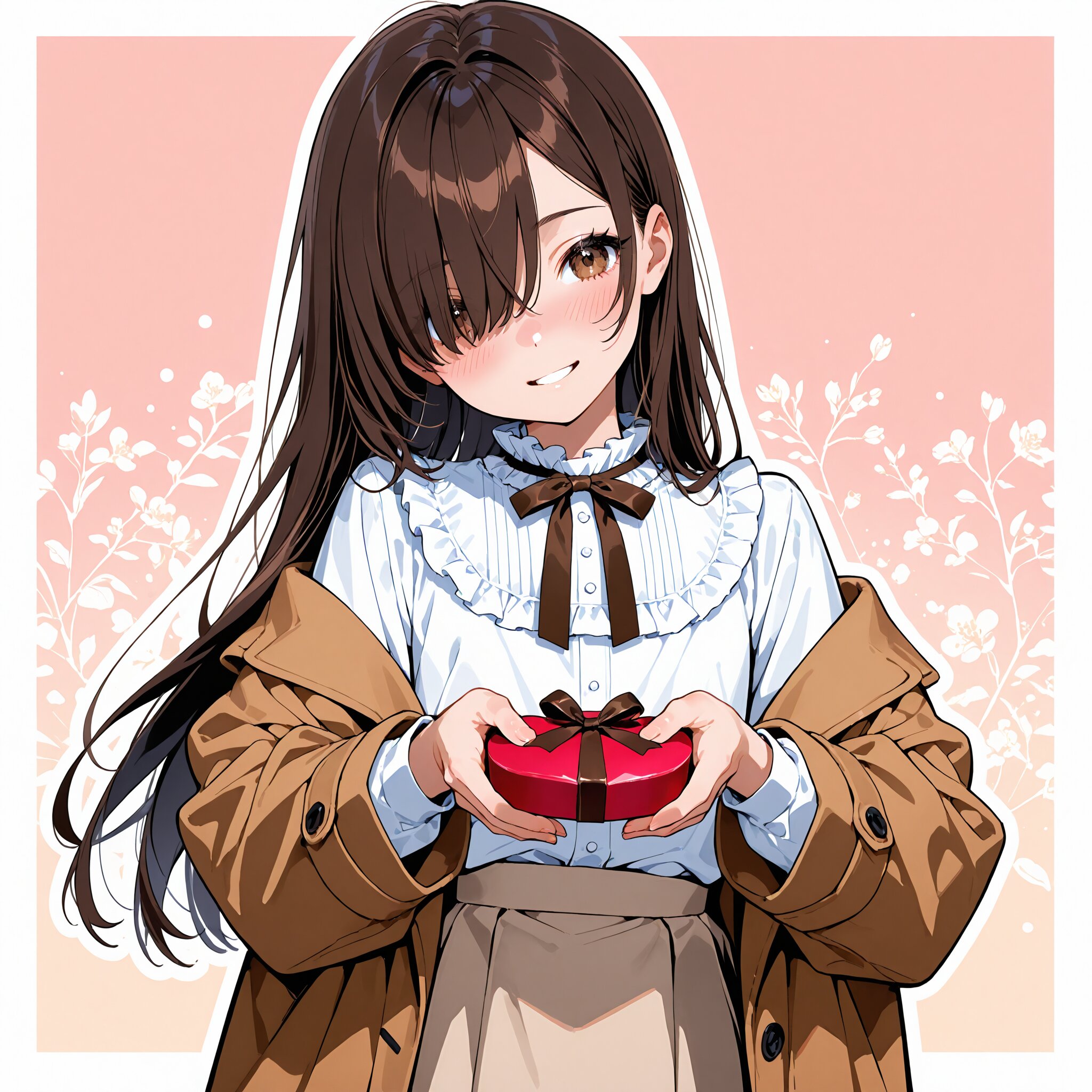 (rating: sensitive:1.2), score_9, score_8_up, score_7_up, score_6_up, source_anime, (delicate illustration), (watercolor style illustration, flat colors), (perspective, super dynamic angle from front, looking away), diagonal view. 1girl, black long hair, hair over eye, one eye covered bangs, straight hair, nose blush, head tilt, (oversized knitted-coat with dark brown bow on sleeve, matching beige skirt with button, frilled blouse, present a wrapped small chocolate gift ((towards)) with both hands), (Valentine's fashion illustration, sweety, ultra-intricate detailed), flat design, white outline, patterned fabric, beautiful composition, in the style of cute anime girl. BREAK insanely beautiful and detailed clothes, intricately hair, beautiful small face, long eyelashes, double eyelids, parted lips, smile, (kawaii, cute), flat chest, slender, {exquisitely delicate skin}, perfect anatomy, beautiful hand, perfect fingers, dynamic angle, dynamic pose, BREAK (DOF), sharp focus on the girl, emphasizing depth, realistic background. BREAK perfect AI rendering, three-quarter view. BREAK (masterpiece, aesthetic quality, 8K, ultra-detailed), (whimsical color palette, bold colors, flat colors), perfect design, amazing quality, high quality, absurdres, highres, natural lighting,
