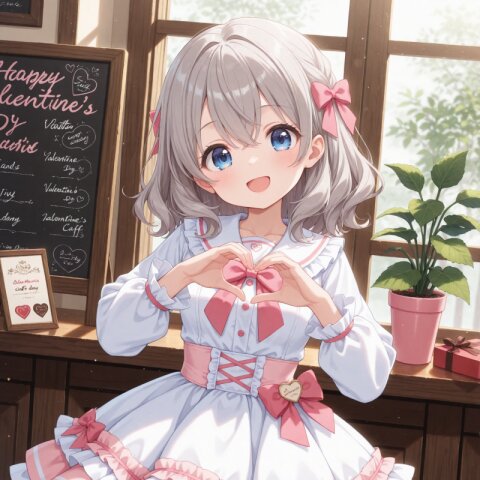 Depth of field, Upper body, Straight-on, (A cute girl:1.1), (Loli:1.1), Solo, :D, Light blush, Holding heart-shaped gift box, (Head tilt:1.05), Looking at viewer, Cute round face, Blue eyes, Medium breasts, Medium hair, Wavy hair, Grey hair, White beret, Sailor motif beret, (Serafuku:1.1), White shirt, White sailor collar, White bowtie, Puffy short sleeves, Frilled sleeves, Blue vest, Button vest, White background, Gradient background, Chocolates motif background, Valentine, Happy valentine, Masterpiece, Best quality, Amazing quality, Very aesthetic, Absurdres, Highres, Hi res, Newest
