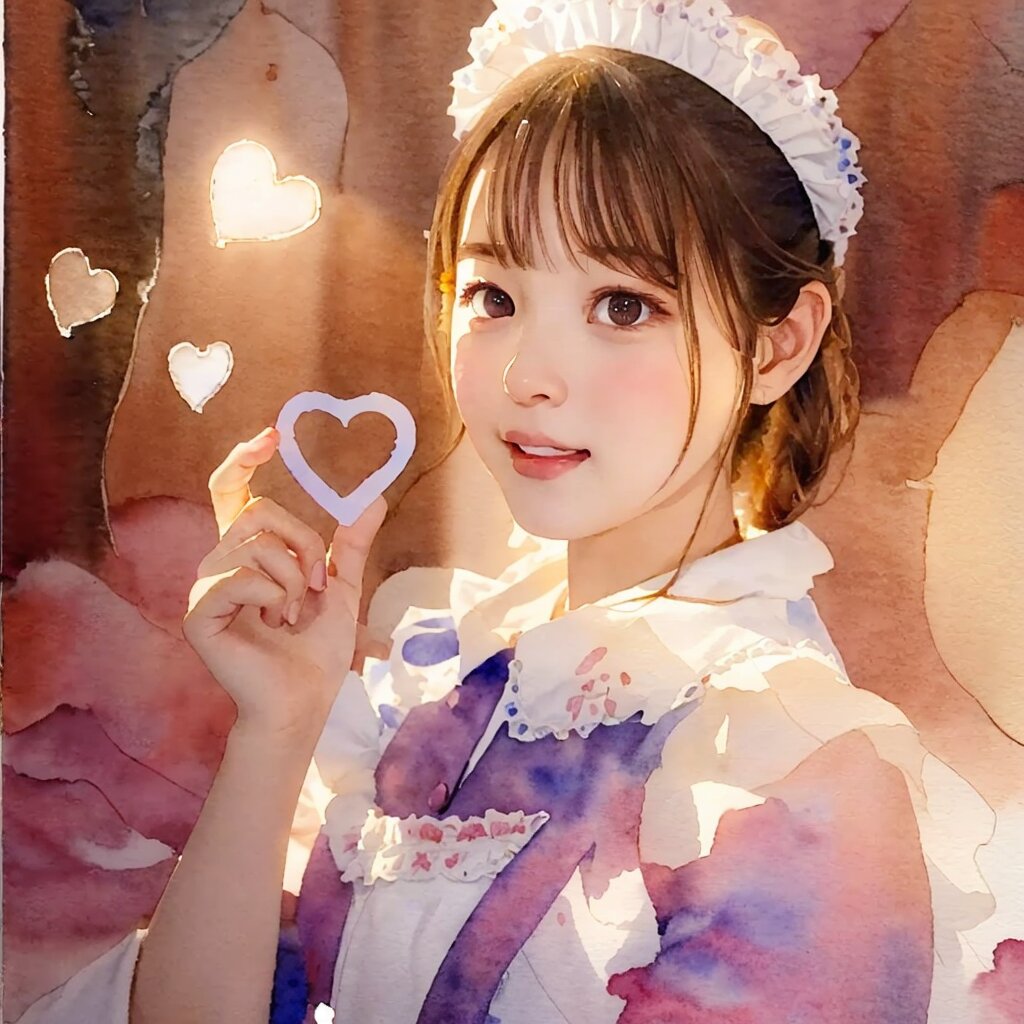 best quality, masterpiece, (watercolor painting:1.34), (line art:1.2), (illustration:1.1), (cel anime:1.0), Portrait, (face focus:1.6), (close up:1.4), soft lighting, soft shadow, light on face:1.2, 1 girl, detailed face, beautiful detailed eyes, brown hair, half updo, (closed mouth:1.2), Restaurant, tables, chairs, cafe, backlighting, (smile:0.9), looking at viewer, maid outfit, maid apron, (hands on Heart Shape:1.2),