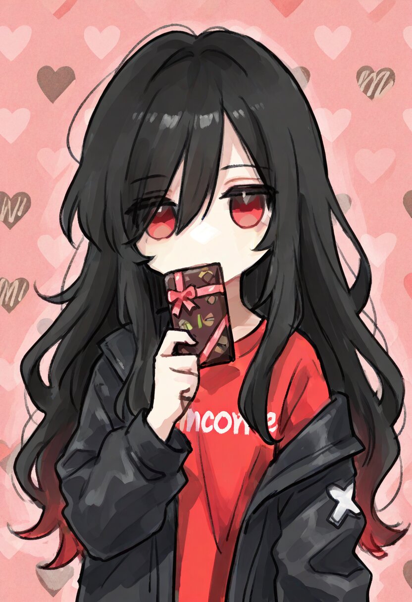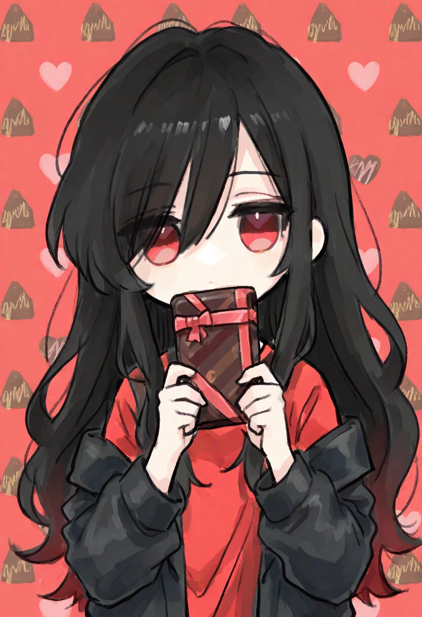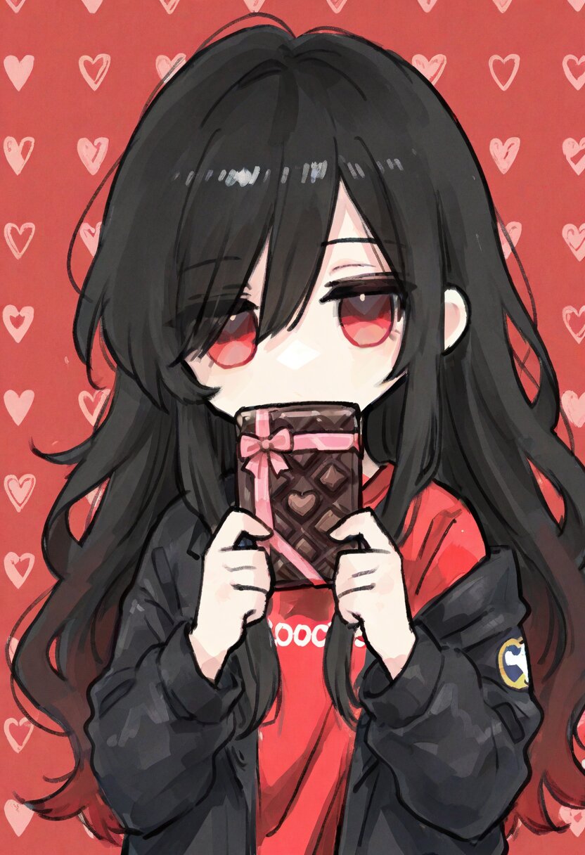 <lora:inmnstyleilxl:0.9>, chibi, solo, 1girl, upper body, looking at viewer, holding chocolate box, black hair, long hair, wavy hair, long bangs, red colored tips hair, red eyes, jitome, black jacket, offshoulder jacket, red t-shirt, Valentine background, ultra-detailed, best quality, masterpiece, very aesthetic, watercolor painting, general