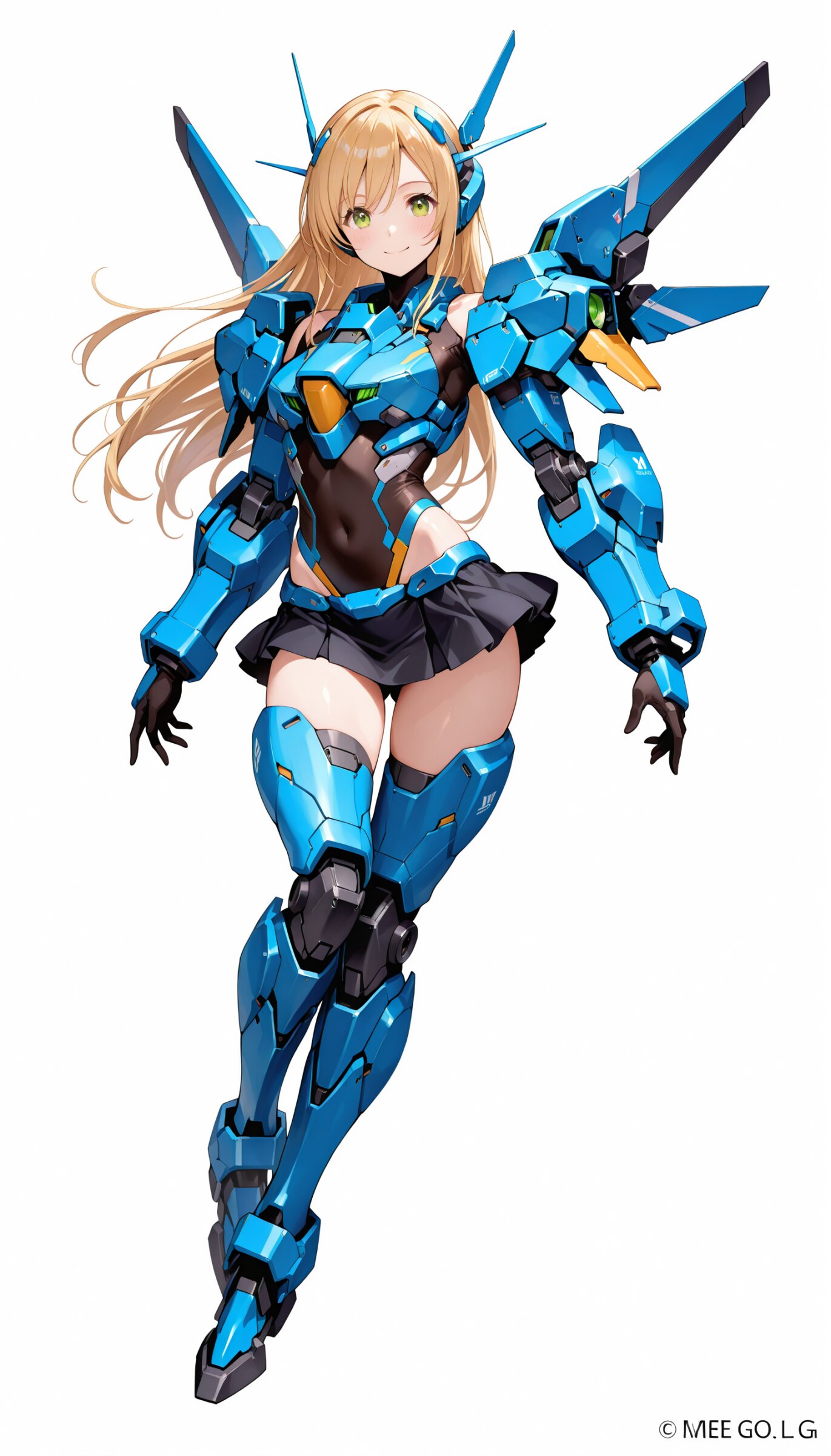 1girl, ((white background)), ultra detailed 8k cg render, masterpiece, high resolution, extremely detailed, mecha musume,mecha shoulder, mech leg, headgear, mecha armor, ((mini skirt)),long blonde hair, dropping green eyes, smile, dynamic posing,