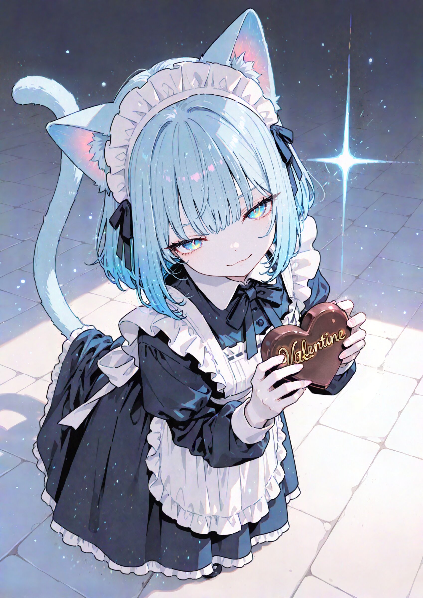 straight-on, (fullbody:1.2) (from above,looking up:1.0) looking at viewer, (dutch angle:1.2) winter atmosphere, earthy white color, winter theme, 1girl, (ultra-detailed), solo, maid, pale skin, pale pale color gentian blue hair, (beautiful slit pupils, naughty face:1.0), long sleeves classic maid uniform, long skirt, maid headdress, maid apron, luminous effect lens flare shiny-glistening cute girl solo from behind, looking another, (Surveillance viewpoint:0.5), (cat girl, cat ears, cat tail, slit pupils, yoga:1.1), holding chocolate, heart-shaped chocolate, gift box, ribbon super fine concept art, hard surface, graceful eyes, masterpiece, best quality, amazing quality, very aesthetic, absurdres, newest, professional art lots of details, , overexposure, sumi-e effect style, 4ur4_illu,shiny, glowing, glowing particles, glowing light particles, light particles, light particles, <lora:noline (1):-0.5> <lora:sdxl2-flat2-512b:0.15> <lora:facelightup_xl_v10:0.5> <lora:V2_yakumo_alchemy:0.5> <lora:Aura_illu:0.1>