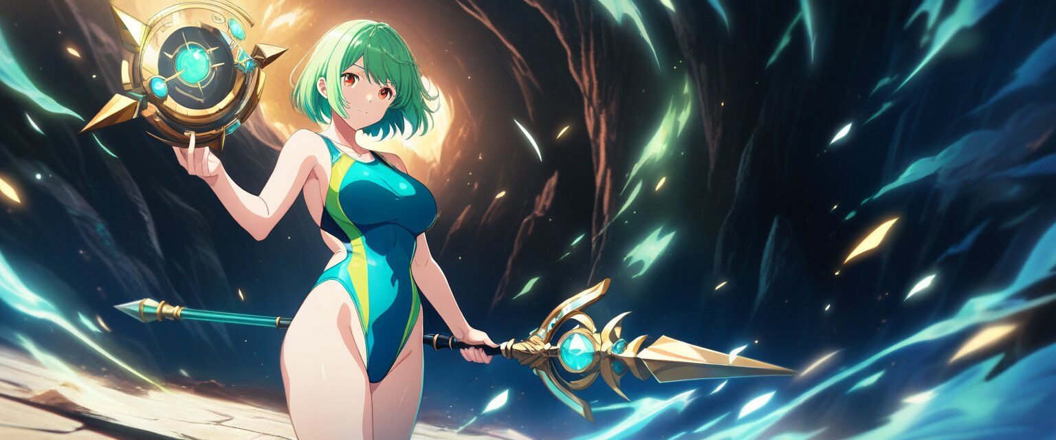 ((masterpiece)), ((best quality)), (ultra-detailed), anime style,cowboy shot, Dark cave,(green competition swimsuit),a cute girl,large bust, short hair, green hair, Holding a weapon in hand, gripping staff, magical effects