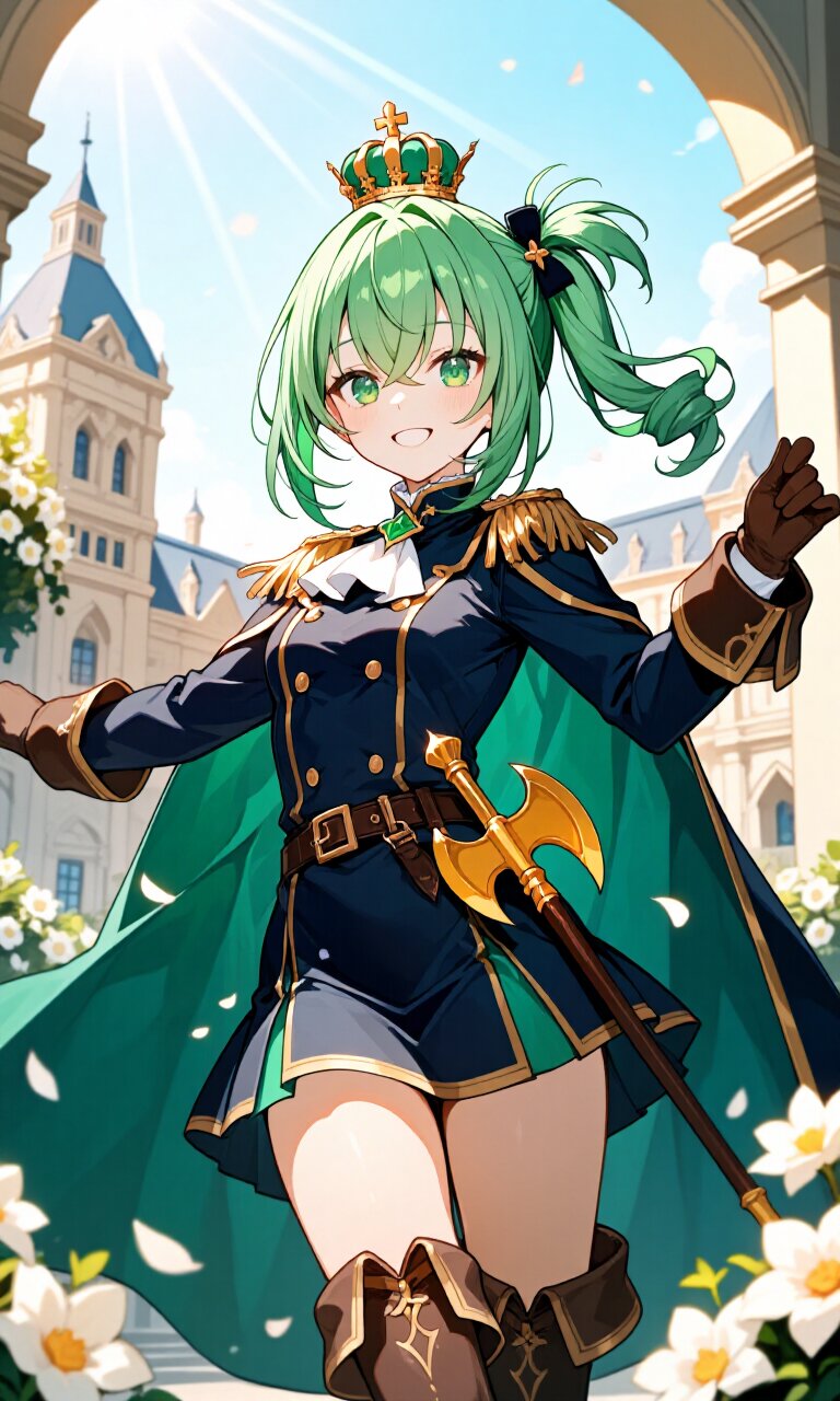 1girl, an 11-year-old girl with ivy green hair styled in a ponytail and crossed bangs, featuring emerald eyes and a delicate, petite frame with a narrow waist and small hips. She wears a (Navy luxurious Prince costume with gold trim:1.6), complete with long sleeves, a (luxurious emerald Cape:1.3), a (luxurious Navy mini skirt:1.4), (luxurious Brown Boots:1.3), and (luxurious Brown Gloves:1.3). A (halberd on waist:1.3) and a (luxurious crown on head:1.4) complete her princely attire. She stands in a dynamic pose, grinning cheerfully with an open mouth, exuding youthful charm. The background features a grand palace with Romanesque architecture, surrounded by blooming flowers under a bright afternoon sky with sunlight, sunbeams, and lens flare effects. The atmosphere is light and romantic, blending classic academia aesthetics with a fairy-tale ambiance. The artwork is insanely detailed, with meticulous attention to skin, hair, and clothing textures, achieving a masterpiece-level quality.