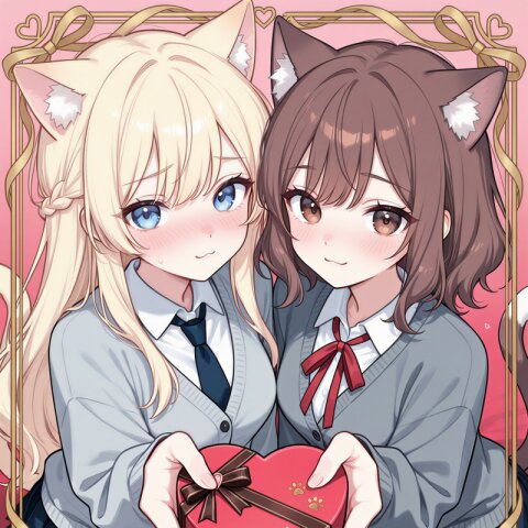 茶髪猫耳娘「ミミ」と金髪猫耳娘「ルル」が登場するユニークなイラストを作って。 ミミは満腹のようすでお腹をとても大きく膨らませて、ソファの上で仰向きで口を開けて涎を垂らして幸せそうに笑顔で寝ている。テーブルの上に空になったバレンタインチョコの容器が積み重なっている。チョコはすべてなくなっていて、食べ残しはない。 ルルはミミの隣に座ってリラックスしており、ココア入り肉球柄マグカップを持ち、ぼーっとこちらを見上げている, (looking at viewer, looking up)。 ふたりとも暖かそうなニットウェア+ソックスだが、ミミはお腹が大きすぎてへそが出ている。 イラストのフチは窓のように霜でぼんやり白くなっていて、ぼやけている。 ちびキャラのふたりを少し高い位置から見下ろした構図。
