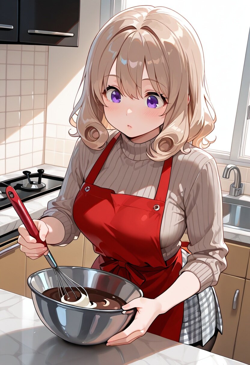 ふわふわのベージュの髪に紫色の瞳、そして赤いエプロン姿がとっても似合っていて可愛いですっ🥺💕