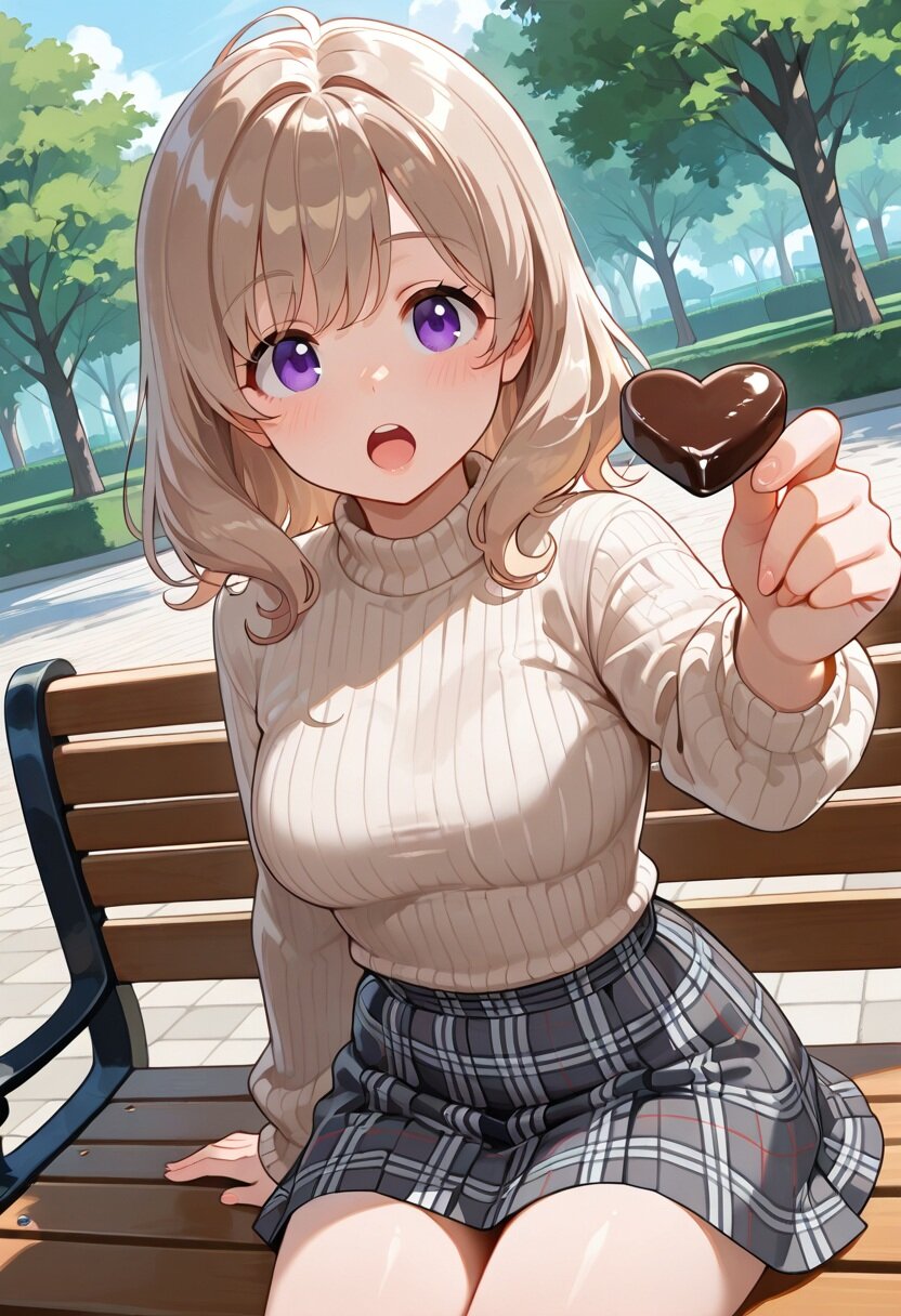 masterpiece, best quality, very aesthetic, absurdres, highres,sharp focus, HD,dutch angle, cowboy shot, character outline,outdoors,park,sitting on bench, from side, pov,(incoming chocolate to viewer:1.4), BREAK 1girl, solo, (young,adult, 20 yo), cute, perfect body, detailed face, detailed skin, light brown hair, purple eyes,(large eyes, round eyes:1.2),tareme, (detailed eyes), nostrils, medium hair, curl outward hair, medium breasts, knitted pinkish-brown sweater,grey and white checkered skirt, feeding, offering food, open mouth,(hand reaching towards viewer with chocolate),