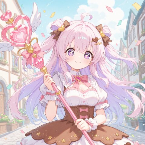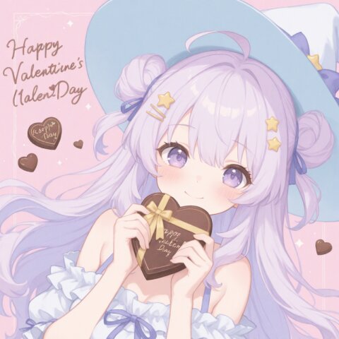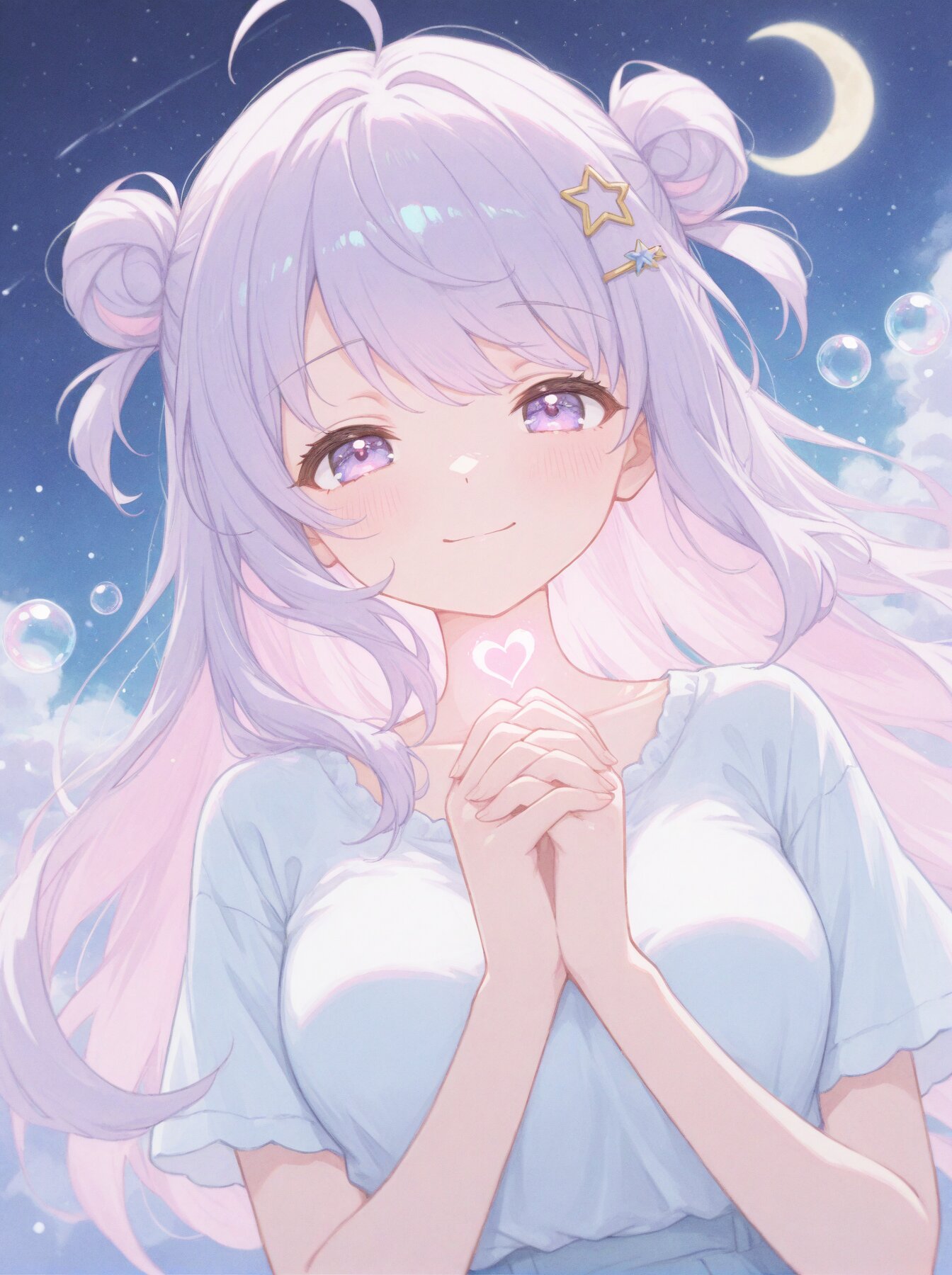 (watercolor style:1.2), (dreamy atmosphere:1.2), (soft lighting:1.1), 1girl, solo, aino mayura, looking at viewer, gentle smile, closed eyes halfway, hands clasped together in gratitude, night sky with stars and a crescent moon, glowing heart-shaped bubbles, (high quality, masterpiece:1.2), deep blues and warm pinks., masterpiece、best quality、amazing quality, solo, kawaii, cute, dynamic pose, dynamic angle, looking at viewer, Pastel color palette, (Upper body: 0.9), soft cute girl with soft lavender hair and light blue inner highlights, long hair with two side buns and loose curls, one stray hair, large, bright purple eyes, a gentle smile, a faint glow, anime-style with emphasized contours, flat pastel-toned shading.single ahoge, medium breasts,star-shaped hairpin,, (soft pastel color palette:1.5), (pale colors:1.3), watercolor texture, matte finish, subtle shading, minimal contrast,