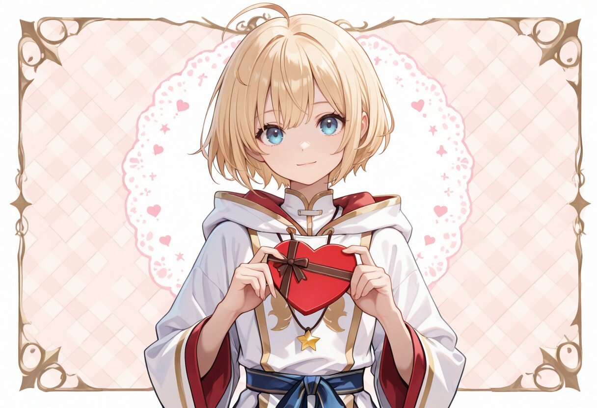 masterpiece,best quality,highres,ultra detailed,highly detailed,detailed eyes,perfect anatomy,general,holding heart valentine chocolate,1girl,solo,17yo,cute,(long sleeves,wide sleeves,star necklace,ahoge,blonde hair, short hair,bangs, blue eyes),slender,small breasts,light smile, closed mouth,priestess,(white clothes, long white robe, long white tabard,hood down,sash),slender girl,cute valentine patterned background,upper body,fantasy,looking at viewer,