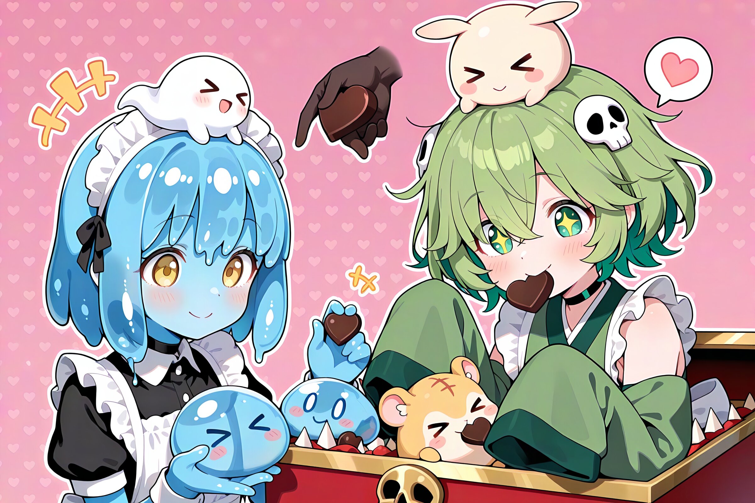 2 little girls, upper body, masterpiece, best quality, amazing quality, very aesthetic, blue slime girl, blue hair, short hair, yellow eyes, closed mouth, smile, cheerful, +++, notice lines, choker, maid outfit, maid headdress, holding chocolate, ghost on her head, > <, heart patterned background, BREAK 2 little girls, symmetrical pose, masterpiece, best quality, amazing quality, very aesthetic, cobalt green hair, short hair, messy hair, (hair over eyes:0.9), green eyes, demon fangs, +_+, smile, cheerful, +++, notice lines, choker, green wa maid outfit, sleeves past wrists, sleeves past fingers, (oversized sleeves:1.2), detached sleeves, skull hair ornament, (floating black ghosty hands:1.2), spoken heart, speech bubble, in mimic chest, holding chocolate with her mouth, humpty dumpty on her head, > <, hamsters, > <, heart patterned background,